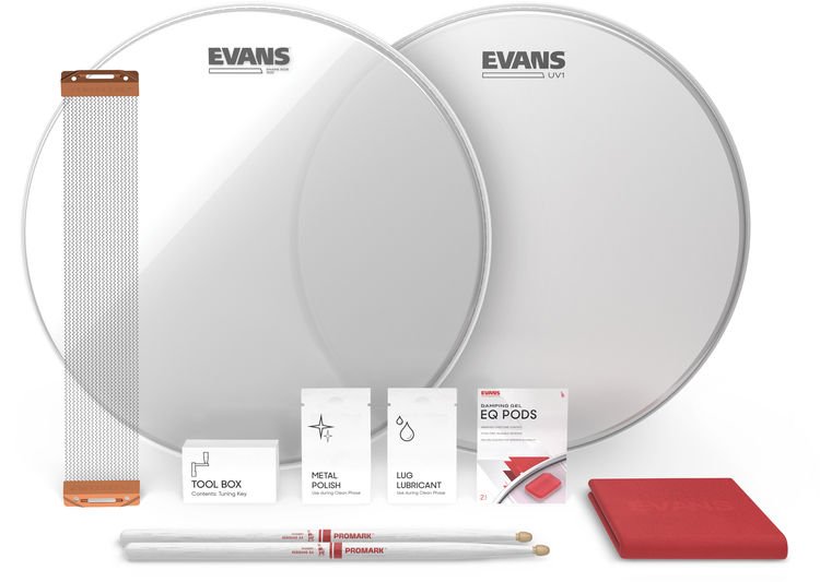 Snare maintenance is just as important to your sound and functionality as shell construction and dimensionality, so put your trust in the versatile UV1 Snare Tune-up Kit from Evans to keep your drum in tip-top shape! Drummers at Sweetwater love the value this kit supplies, featuring both UV1 coated and clear batter heads for unique tonal experimentation, and a pair of ProMark drumsticks to get testing and playing right away. Replacement snare wires, an extra tuning key, a lug lubricant, and a 2-pack of Evans EQ Pods will help you get back to that ideal snare tone with ease. And when it comes to keeping your snare looking stunning, use the included metal hardware polish and red microfiber cloth to wipe away smudges and stains, ensuring your snare shine up under stage lights! This kit is a value-packed must-have for gigging drummers and for musicians wanting to preserve the quality of their gear.