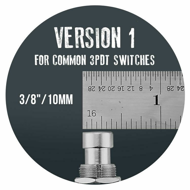 Barefoot Buttons come in Version 1 and Version 2. Version 1 fits common 3PDT switches (3/8 of an inch / 10mm). Version 1 Big Bore fits larger 3PDT switches (up to 7/16 of an inch / 11.1mm). Version 2 fits common SPST tap switches (5/16 of an inch / 8-1/2mm).