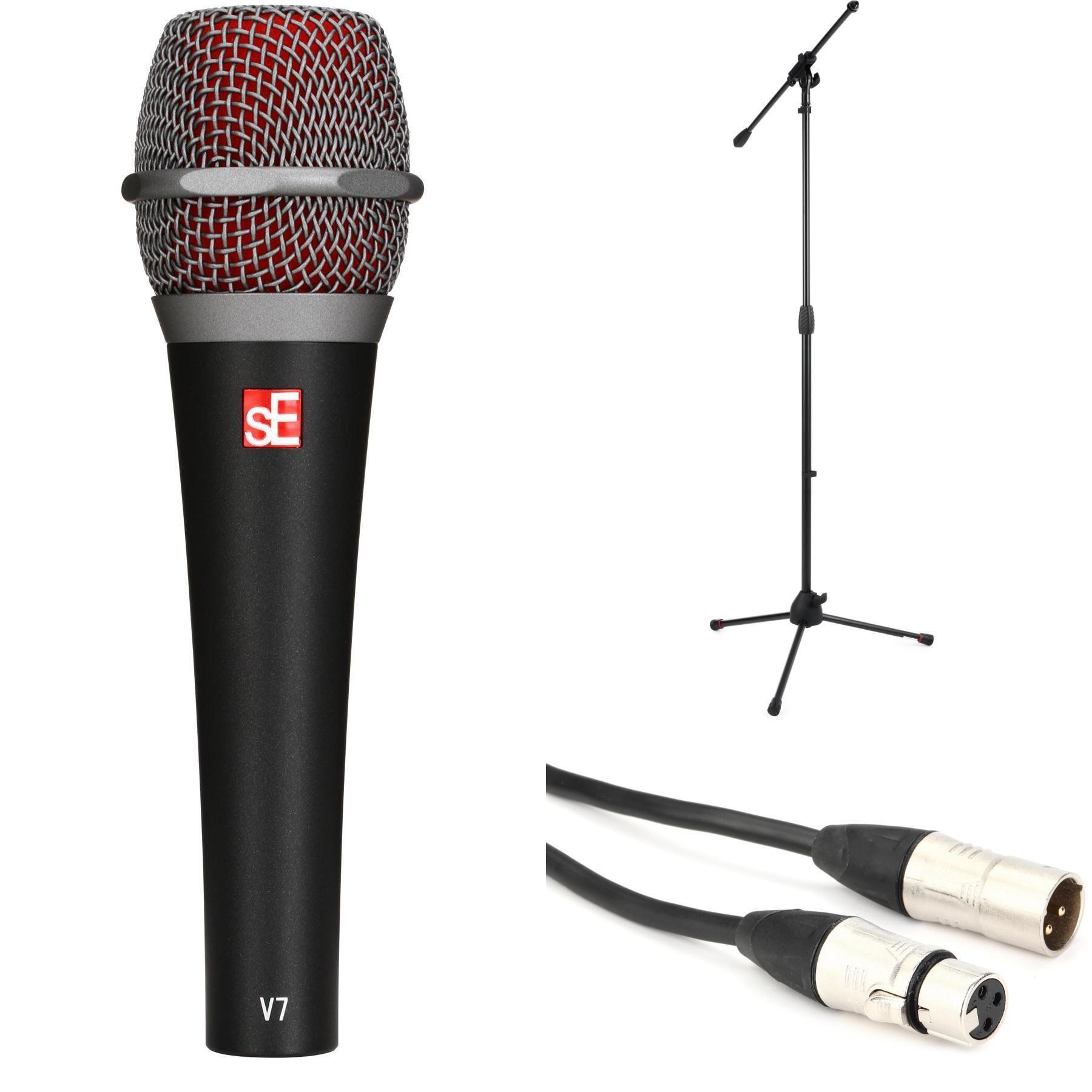 With the sE Electronics V7 handheld dynamic microphone in hand, you'll hit the stage with confidence. Armed with a specialized aluminum voice coil, the V7 offers a natural-sounding reproduction of your voice while simultaneously giving it a crisp, open quality for professional performances. Similarly, a supercardioid design yields excellent isolation from stage noise and delivers massive amounts of gain before feedback. Rumble and handling noise aren't a problem for the V7 either, thanks to its integrated shockmount. An internal windscreen further prevents wind noise and plosives from ruining your performance. Rounded out by a rugged construction to endure even the roughest venues, the sE Electronics V7 handheld dynamic microphone is sure to grant years of reliable, high-quality performance.
