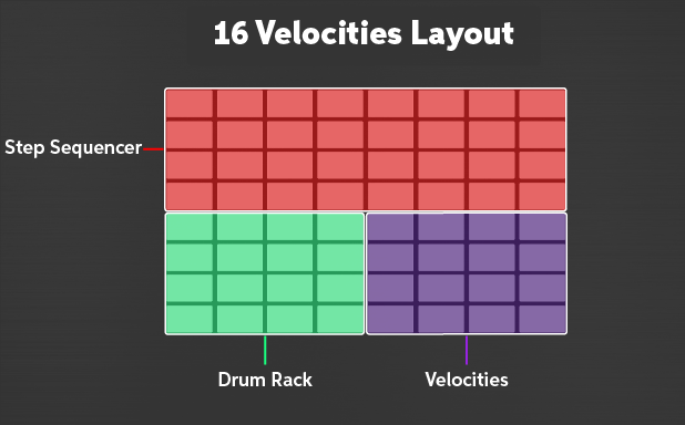 This Layout is similar to Loop Selector in regards to where the pads are assigned. The only difference between the two is that instead of selecting clips, the bottom right 16 pads allow you to choose the velocity (intensity and level) of individual samples. While the Push 2’s pads are velocity-sensitive, using this mode can give you a much more dynamic range.