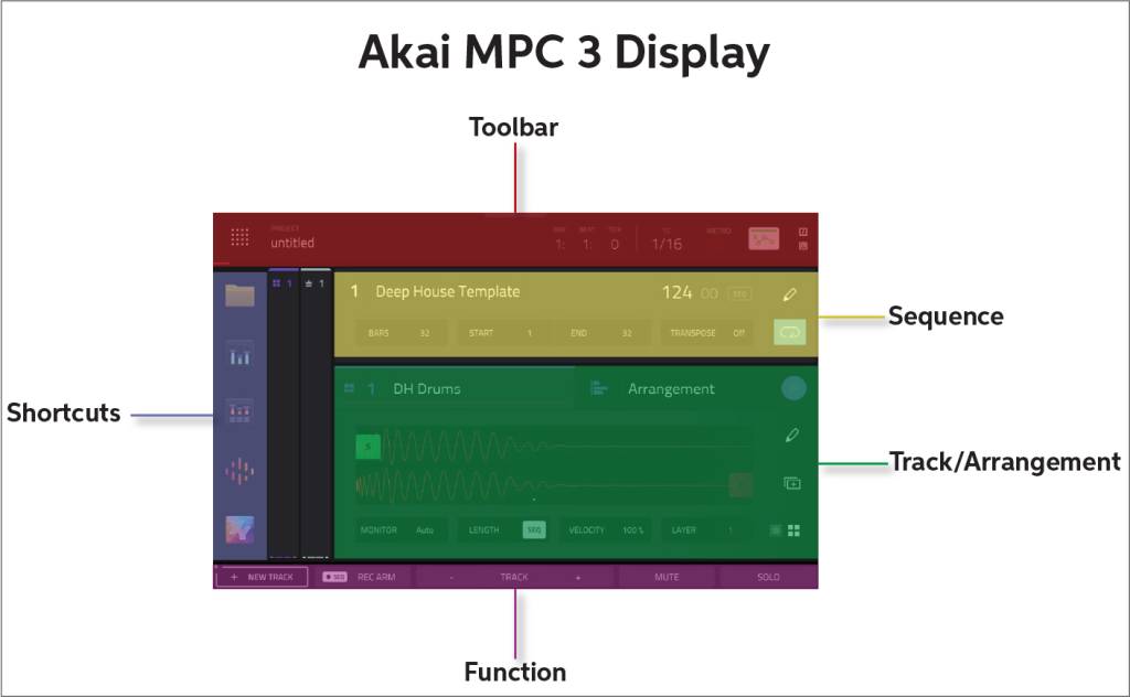 You can break down the MPC3 display into six sections: Toolbar, Shortcuts, Function, Track/Arrangement View, Sequence, and Mixer Strips.
