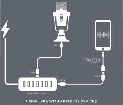 iOS devices can’t provide enough power to your Lyra, so if you own an iOS device that is 10.7 or higher, you’ll need a powered USB hub, an official Apple Lightning to USB camera adapter, and a USB-A to USB-A cable.
