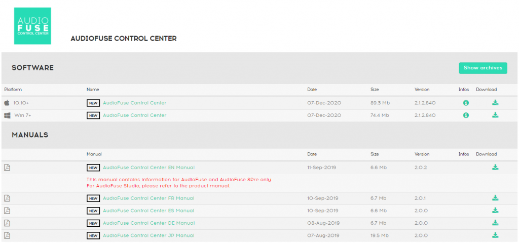 - Go to the AudioFuse resource page, locate the latest AudioFuse Control Center’s latest version, and then click the Download icon for your OS.