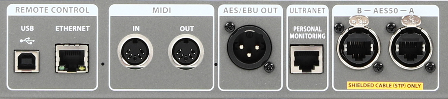 The Behringer X32 has RJ45 ports labeled “Ethernet,” “Ultranet,” and “AES50.”