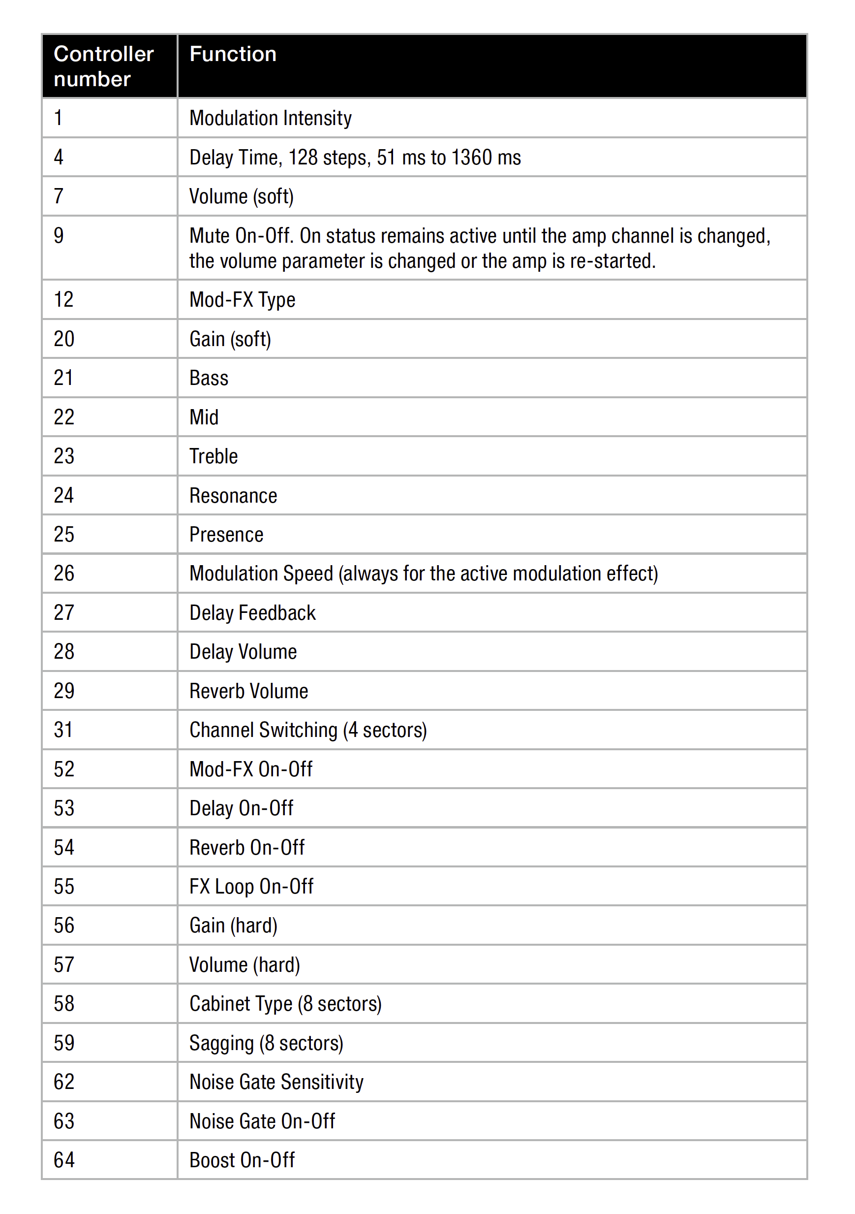 The Black Spirit 200 Floorboard Amplifier can send and receive MIDI signals, which lets you control the floorboard remotely. Send MIDI program changes (PC) to the floorboard to recall presets according to their respective preset numbers. You can also control your floorboard’s individual parameters with MIDI controller change messages (CC). Use the MIDI implementation chart (above) to configure your external MIDI controllers to the correct controller change numbers.