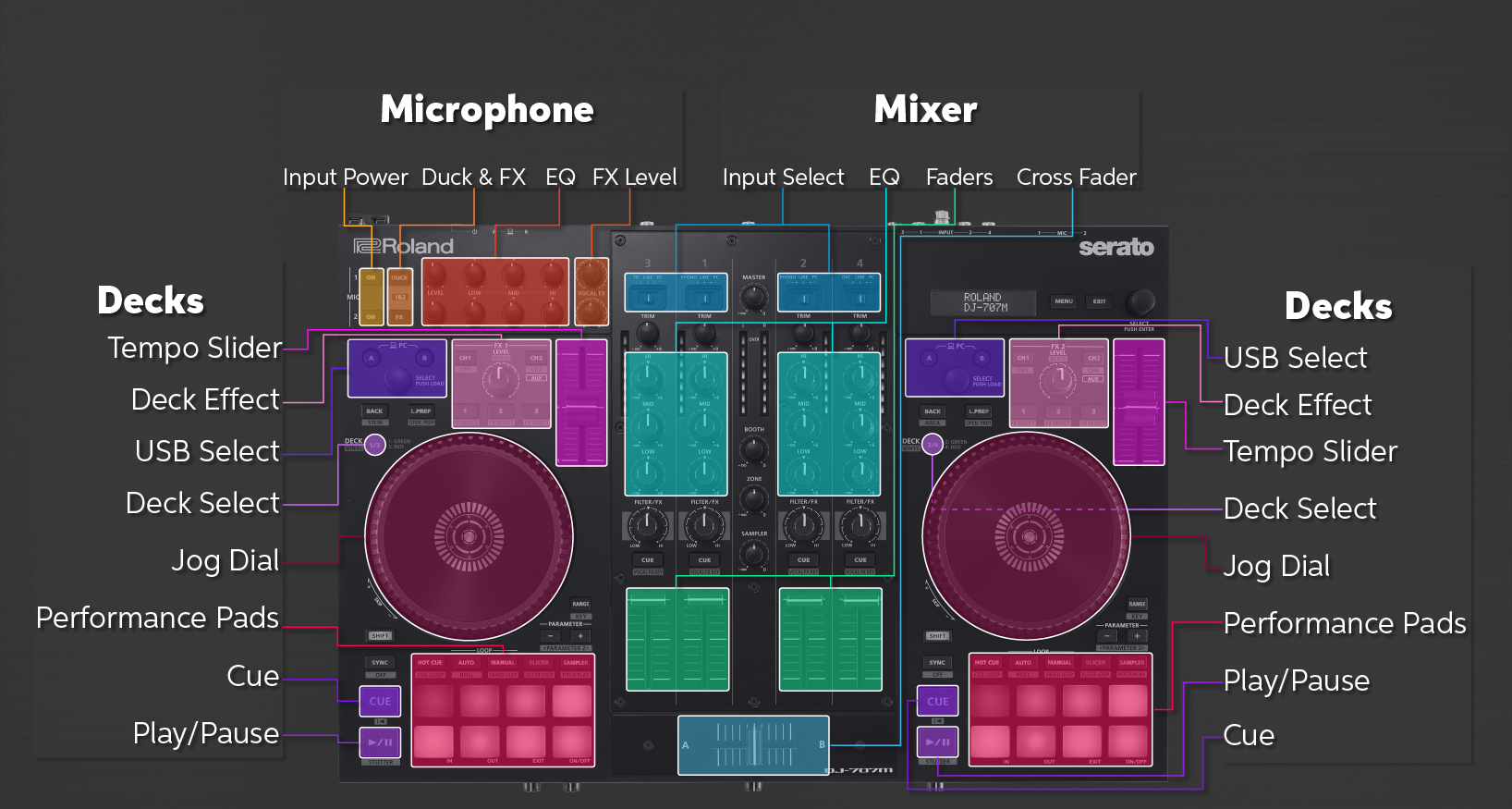The Roland DJ-707M has four primary sections, which include the decks, mixer, effects, and microphone. Each section has unique functions, and most have additional features when holding down the SHIFT button. For a full list of operations and menus visit the user manual.