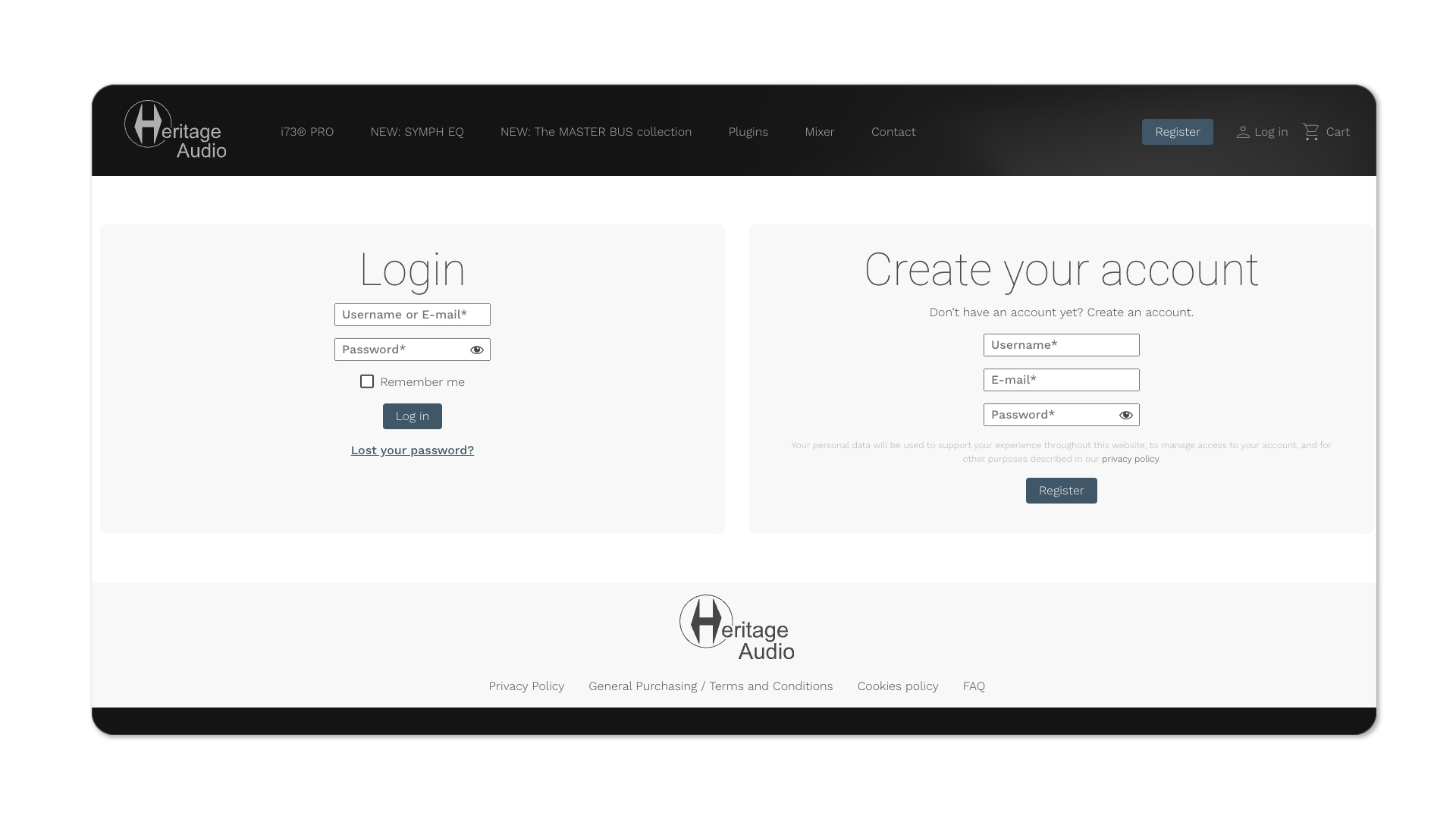Heritage Audio software requires a Heritage Audio account. If you already have a Heritage Audio account and want to register your new software to that account, please verify the username and login before proceeding. Most users will only have one account, but in some cases, you may choose to create another account to distinguish different locations, users, etc…