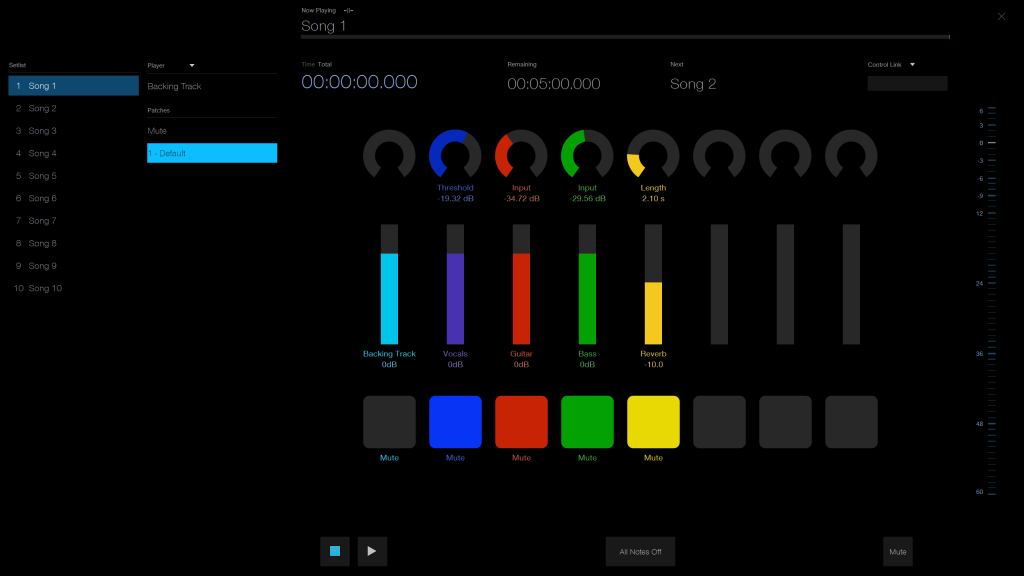 The Overview is the “timeline” for your show. From here, you can update the name of the setlist, add the Players, recall patches you’ve created, and save patches for tracks you’ve created. You can also rename the setlist and change each color of the Players, which makes it helpful to distinguish which track is which, particularly in lower light settings.