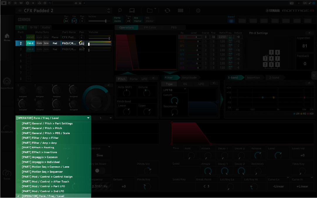 For example, if you load the CFX Padded 2 preset and select the Piano part, you can change Part and Element settings. However, you can change the Part and Operator settings if you choose the Pad part.