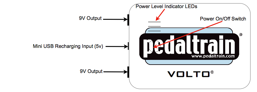 Next, make sure you’re pressing the power button on the VOLTO to turn it on. The power button is located between the “P” and the “E” in “Pedaltrain” on the front of the VOLTO.