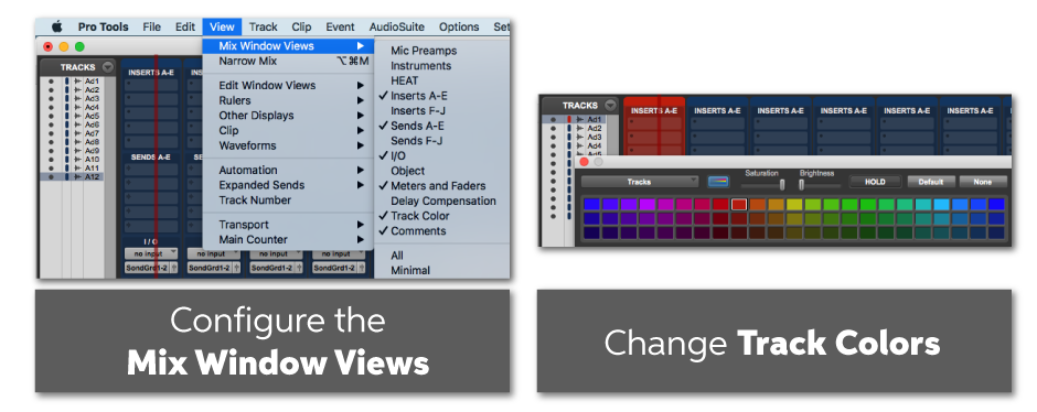 In the Mix Window Views, make sure that Inserts A-E, Sends A-E, Meters and Fader, Delay Compensation, Track Color, and Comments are checked. Follow the instructions below.