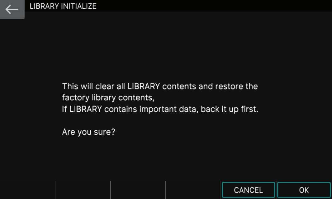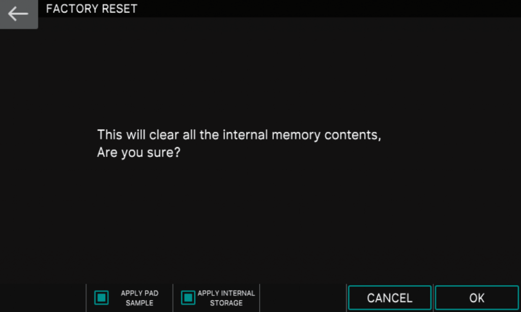 Once your user data is backed up, you can then perform a factory reset or initialize the internal storage. The factory reset will bring the Fantom back to its out-of-the-box settings, whereas initializing the internal storage will only set the factory library contents back to its default state. Any menu or system settings will not be erased.