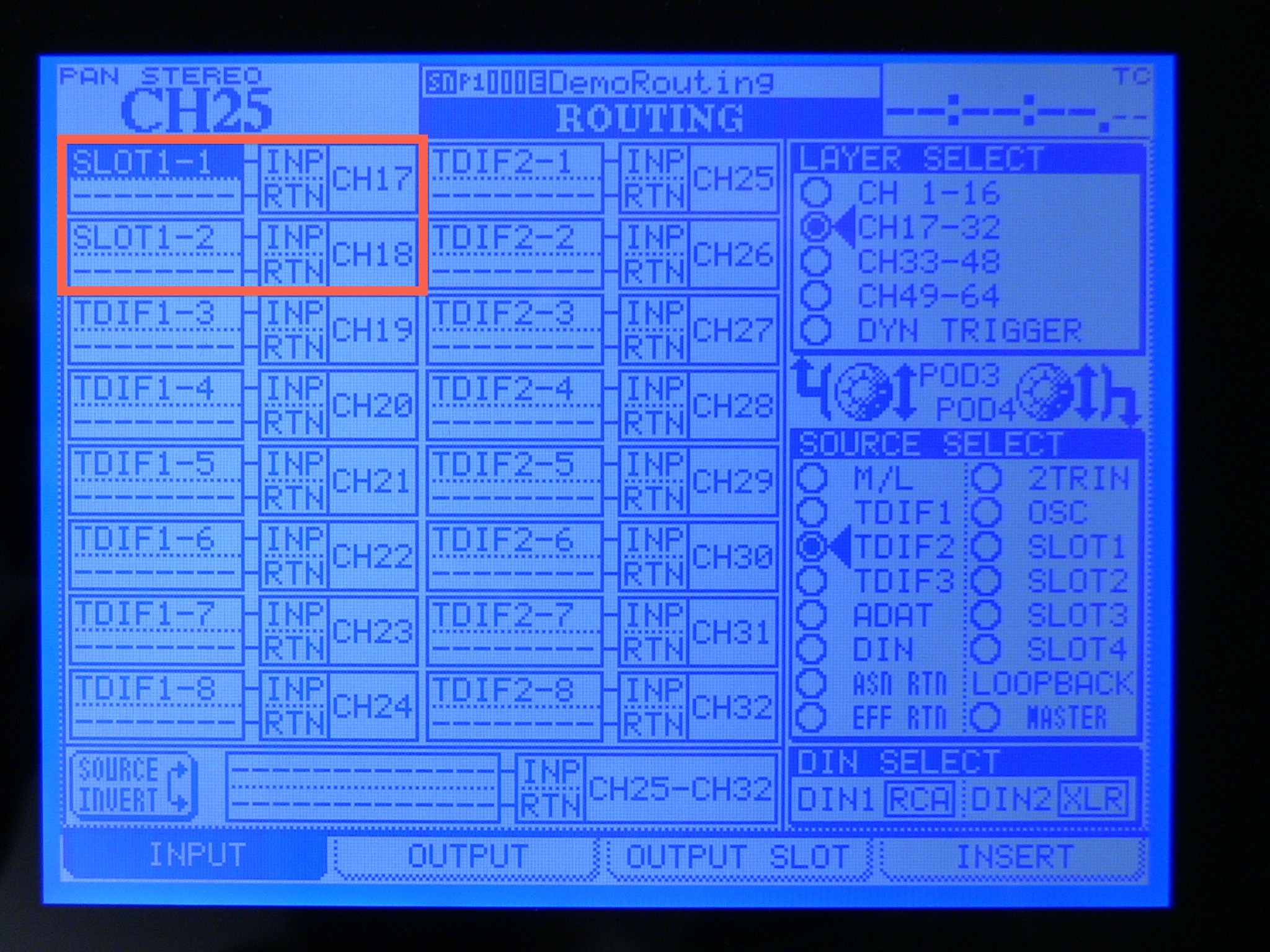 - Use the arrow keys, data wheel and enter button to set INP Ch17 to Slot 1-1 and INP Ch18 to Slot 1-2 (if you want to monitor more than just two channels through the board, for instance to mix in the board rather than mixing in software, you could set up additional inputs on the board to mix additional outputs from Logic).