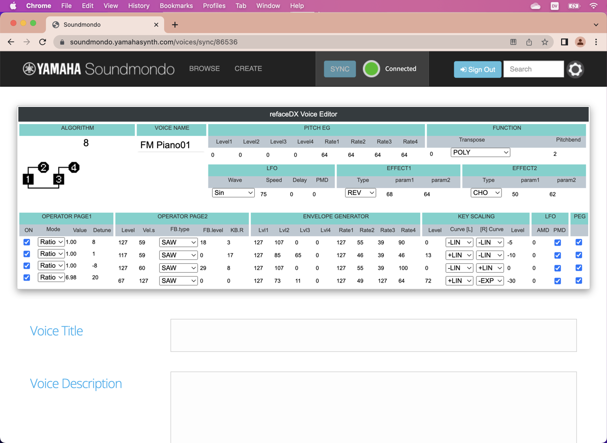 On your reface keyboard’s controls, if you move any slider or change the position of any switch, you will see the corresponding slider or switch move in the display in the Soundmondo browser window. By moving a slider, you are, in effect, creating a new preset, so the browser window displays the settings with a blank Voice Title and Voice Description. You can save the preset by giving the preset a new title and description, tags, and values for other fields. Scroll down to the bottom of the page. Under Accessibility, choose Public or Private, and click Save.