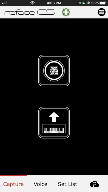 Clicking Capture takes you to a new view where you can upload your current reface sound to your device. You will be prompted to save this as a Voice. You can also generate a QR code representing the saved Voice which you can text or email to other reface owners so that they can recall the preset in Soundmondo and load it on their instrument.