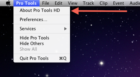 3. Click “Pro Tools” in the upper left hand corner of the screen next to the Apple logo and select “About Pro Tools.”