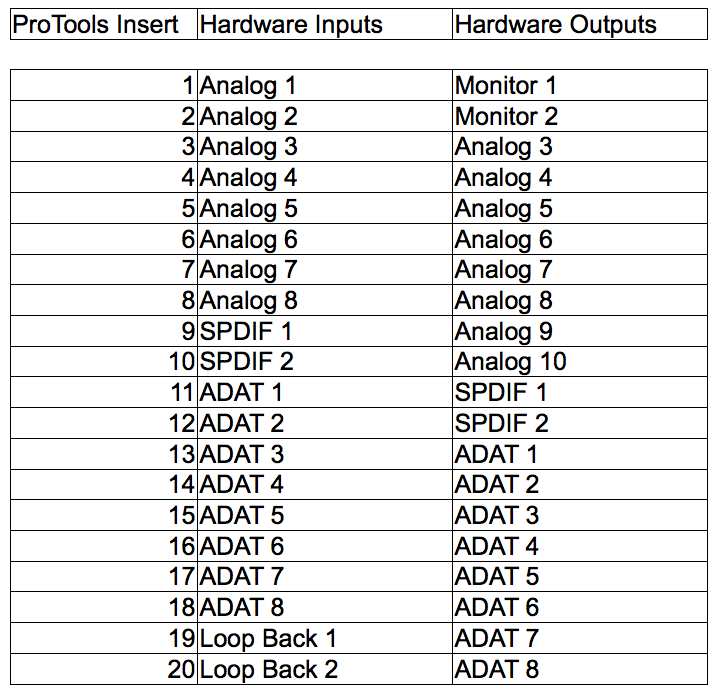 Using hardware inserts in Pro Tools with a Saffire Pro 40 can be tricky. Pro Tools uses a 1-to-1 input/output matching scheme with hardware inserts. However, the Saffire Pro 40 has 10 analog outputs, but only 8 analog inputs. This means that after you use the first 8 hardware inserts, things start to get a little skewed. Refer to the following chart: