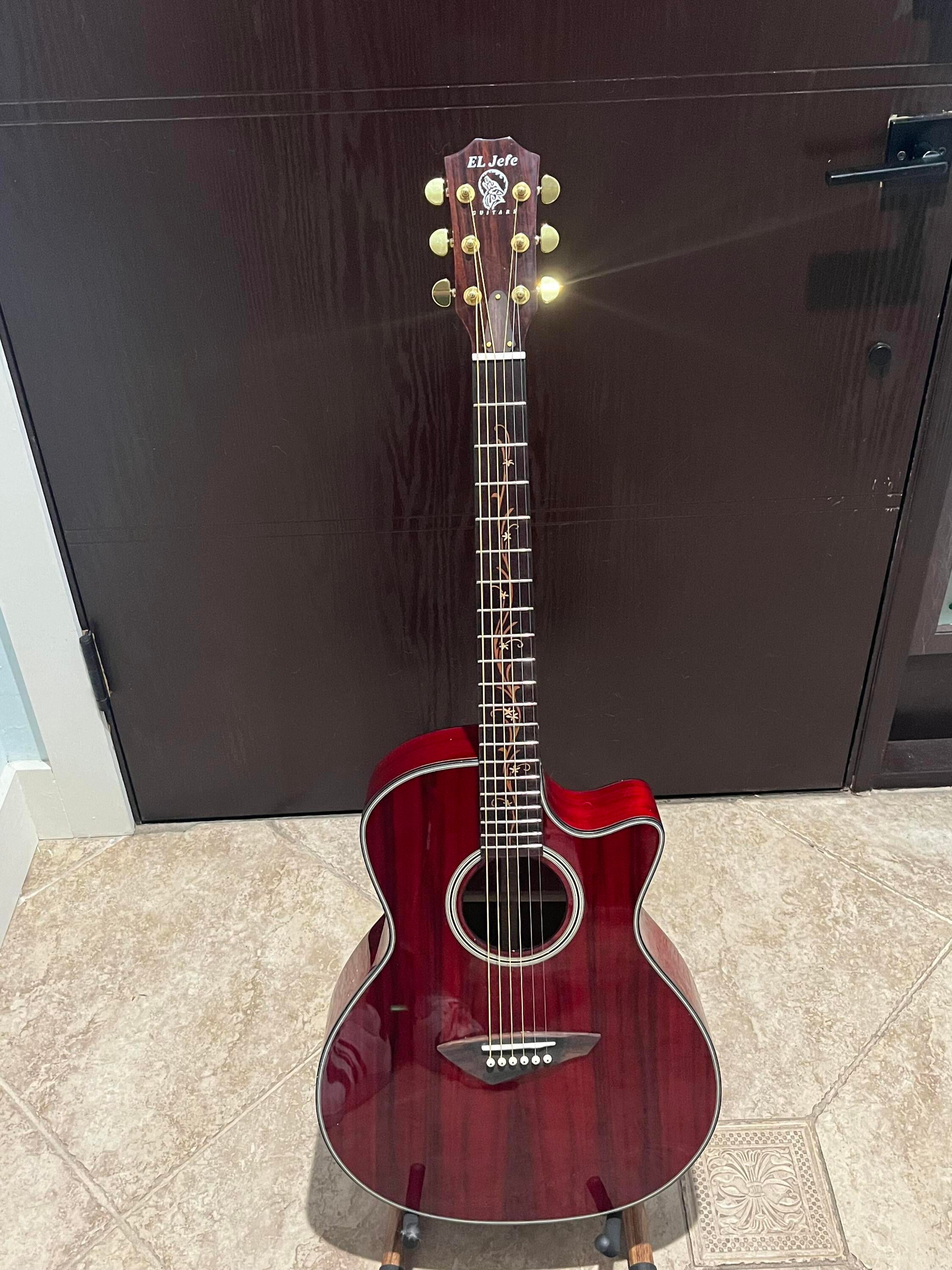 Introducing the EL Jefe "Cherry bomb" acoustic guitar, a stunning masterpiece designed for right-handed guitarists. This model features a beautiful body made of Koa, a top-quality material known for its durability and excellent resonance. The guitar has a vibrant red finish that adds a bold touch to its overall design.