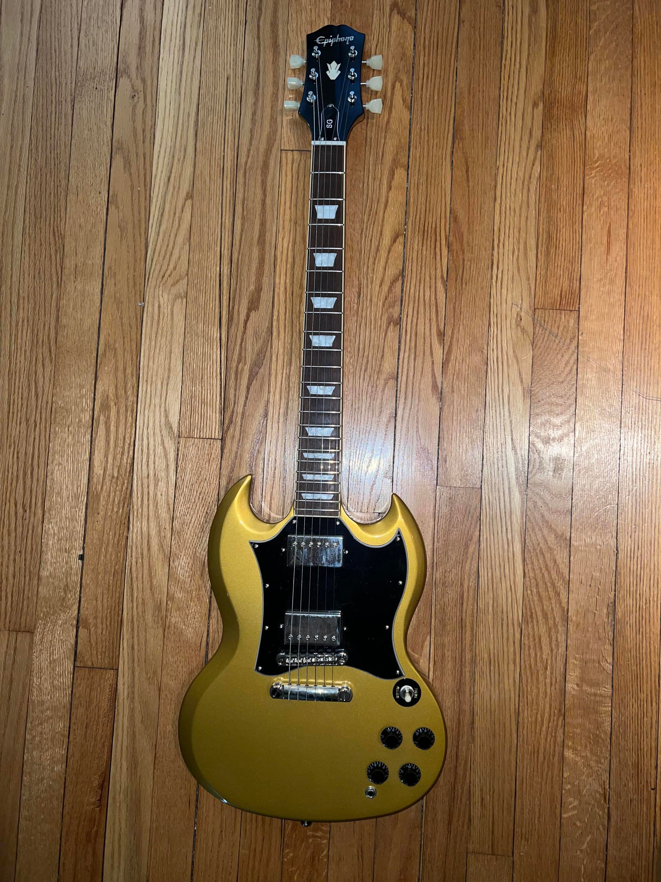 Epiphone SG traditional pro in all gold color which was exclusive color to GC. Guitar has been played but not that much plastic still on pickguard. Coil tap on volume knob, 60's style neck. There are small finish check/crack by the nut on both side not a broken headstock or a break. No case but will be packed properly with double box.