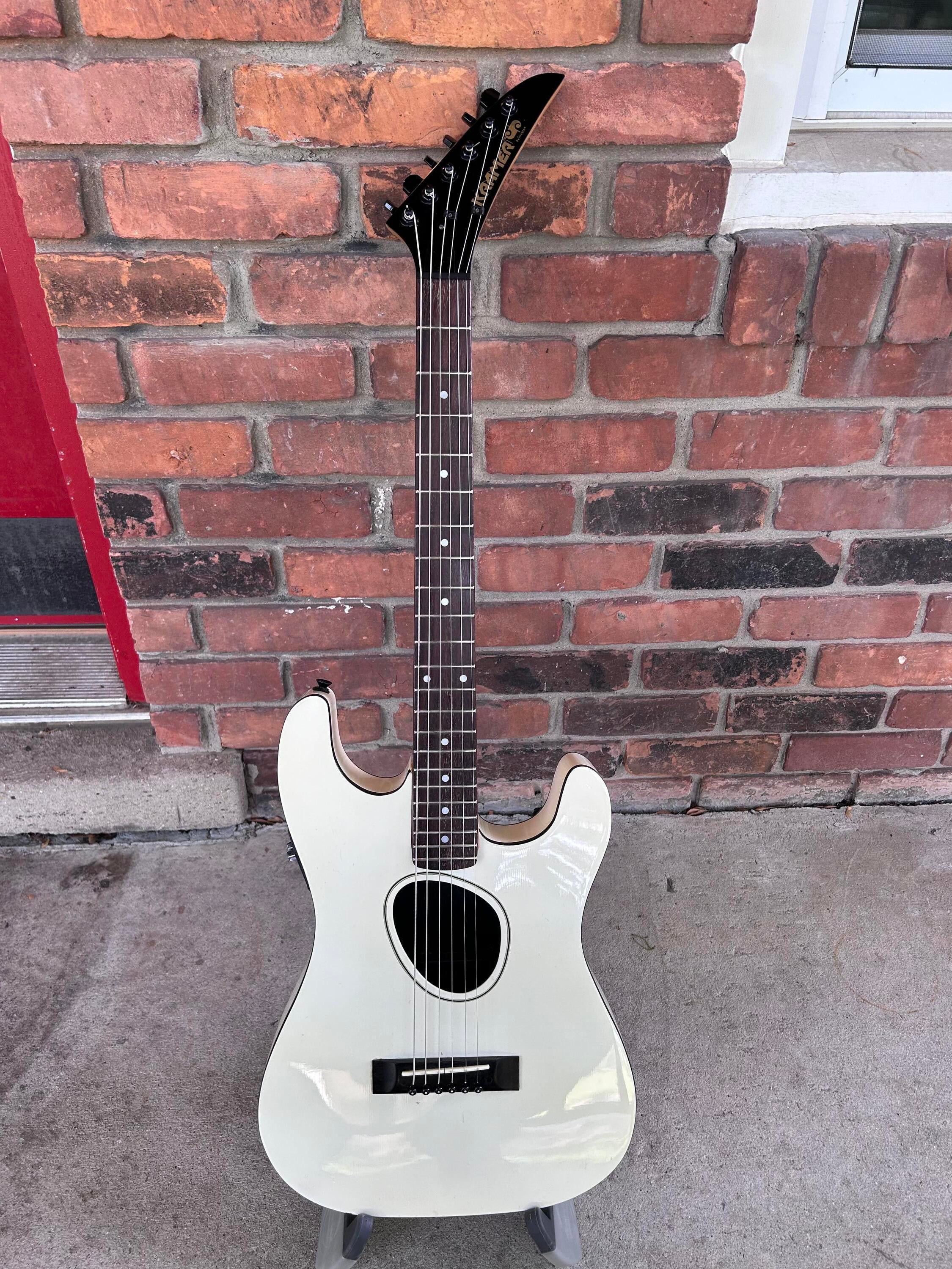 Up for sale is my 80’s Kramer Ferrington Custom super strat shaped acoustic. This thing has a fast Kramer neck with plenty of life left in the frets. It has its fair share of ware on it due to its age, but no major structural problems. There is a tiny crack in the back of the neck at the headstock, but I believe it is just a finish crack. I did my best to make it move and the headstock is solid. The guitar stays in tune well. It sounds surprisingly good plugged in as some guitars this style seem to be lacking in that department. This thing truly is the best of both worlds. Whether you need something small and easy to carry for open mic nights and the odd acoustic gig, or just a great couch guitar, this Kramer is up to the task. Please ask any and all questions. I’m happy to provide additional pictures upon request. Thanks for looking. Have a great day!