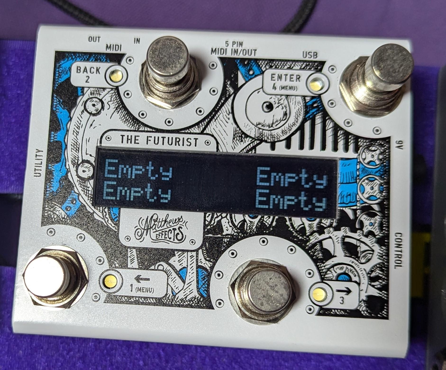 Up for sale is my slightly used Matthews Effects The Futurist MIDI Controller, a fantastic and compact pedal that I bought in 2022 to pair with my HX Stomp. This MIDI controller has been perfect for my small pedalboard setup, with its sleek white finish and unique black and blue designs on the face—a design I don’t believe they make anymore, making it even more special.