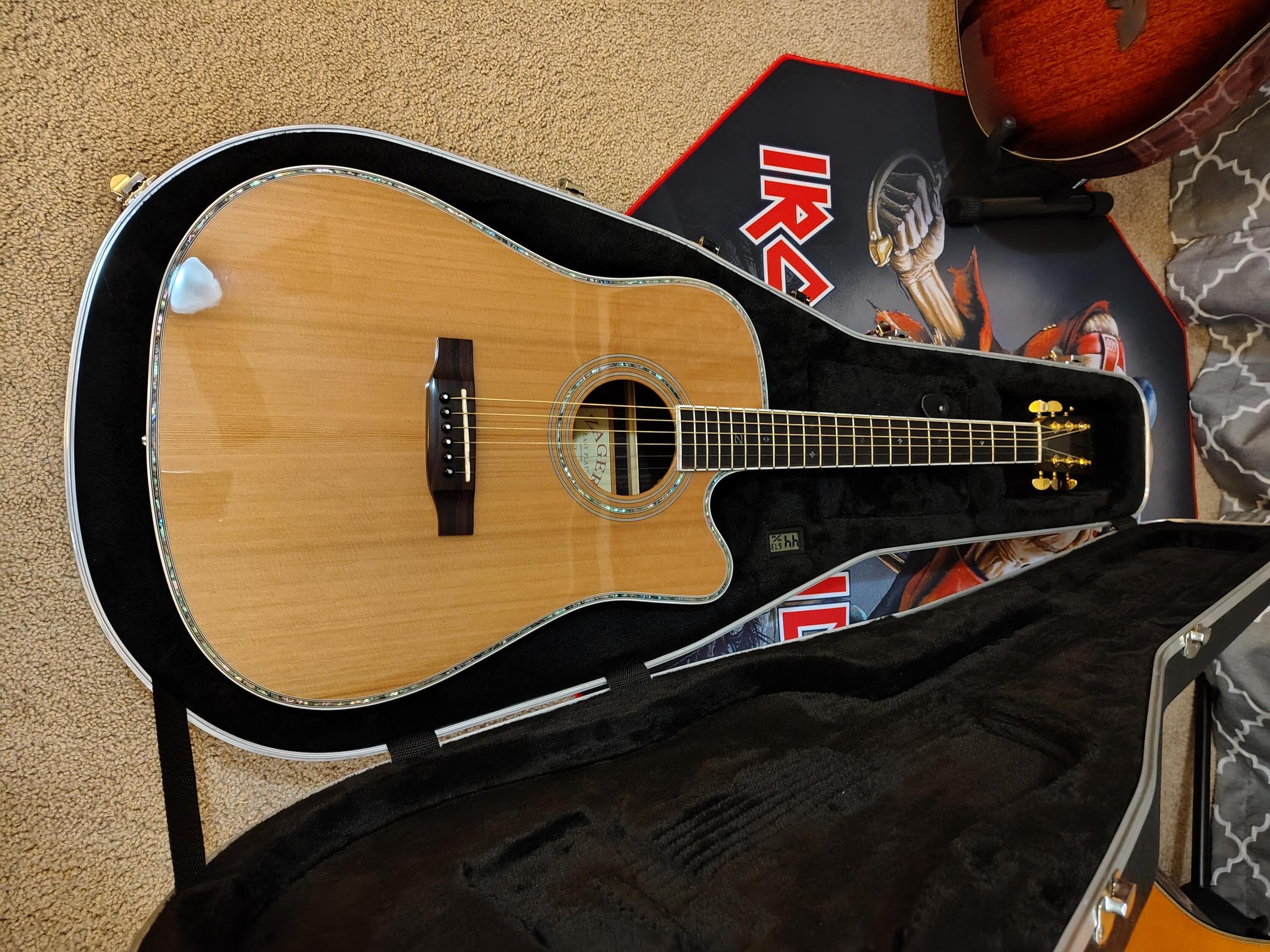 Excellent to mint not a blemish on guitar or case all original full size with single cutaway.Solid red cedar top solid Indian rosewood back and sides bone nut and saddle Grover tuners AURA Fishman sound imaging system. Easy play pro series