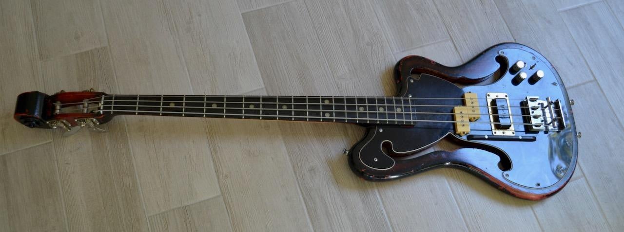 The bass has been played a lot and shows some wear but still has an unique look, major vibe and robust tone. The neck is not wide but quite rounded to give a nice feel. Included is a rip stop nylon custom made-to-fit gig bag.
