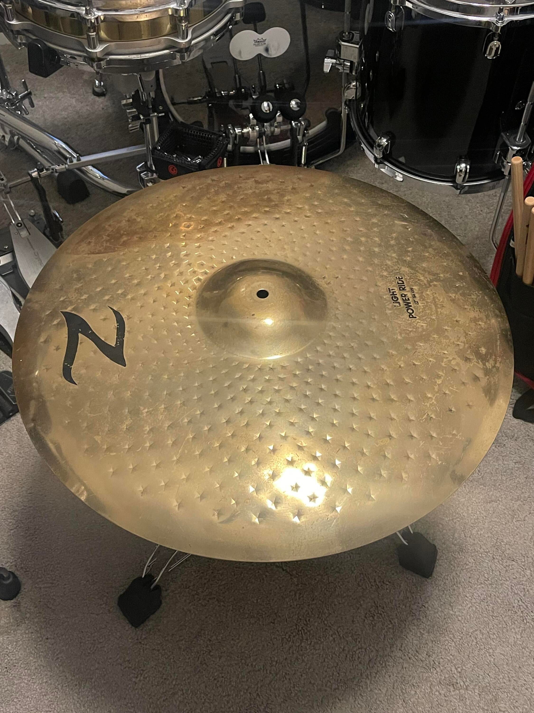 Hello and this is the Classic Zildjian Z Light Power Ride at 22 inches. A great Z Ride that was used by Wil Calhoun of Living Color when he was with Zildjian. This great Ride has fantastic definition and a great bell and the projection is excellent. All the logos are in tact and it has the nice star pattern that the Zs are known for. It weighs 4,116 and is a nice heavy weight. Now the light power Ride makes it a little lighter with a little more wash on the bow and the bell. It makes it not totally dead like the heavy power Rides. Just barely a little corrosion on one of the sides on top and that’s about it. I won’t be charging shipping for this gem and Metal drummers each your heart out and who will be getting this classic Ride for their set?