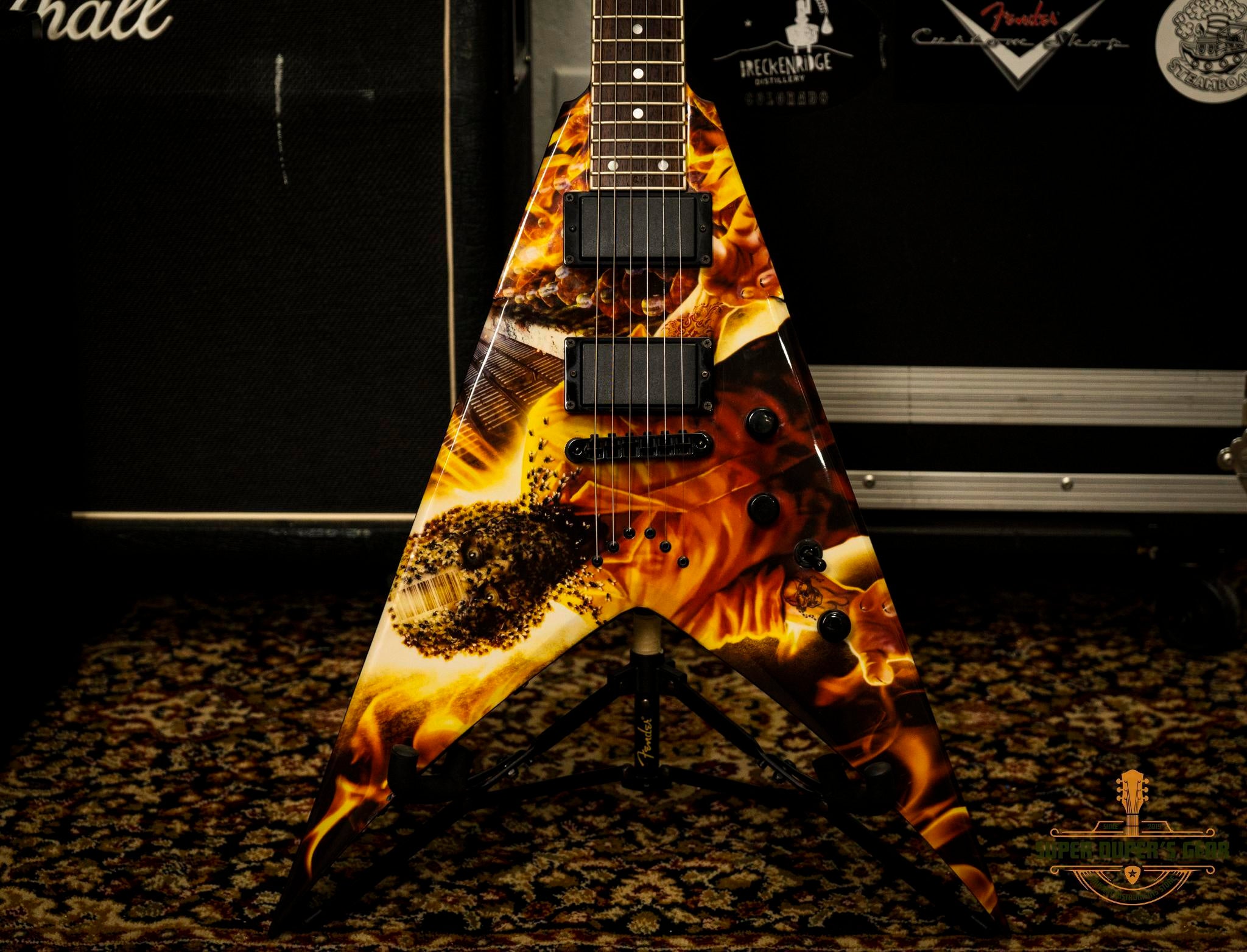 Donning eerie 'End Game' graphics, this exciting signature V-guitar will turn heads no matter where you play. Other 'End Game' features include a 25.5" inch scale length, modified 'V' style mahogany body, special set mahogany neck with a 'C' shaped profile, and a head stock design with in-line tuners.