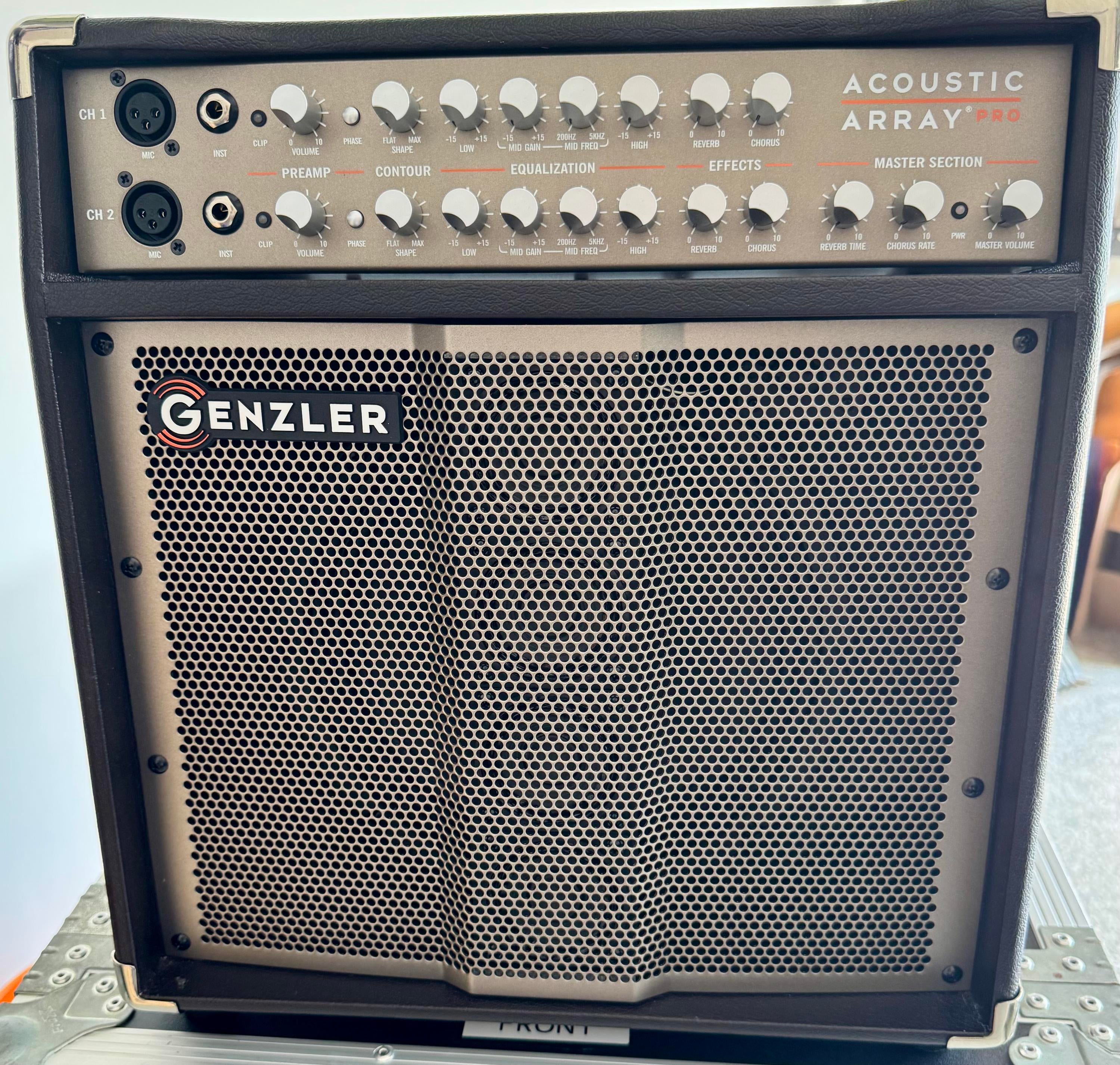 The Genzler Acoustic Array Pro Combo is an ideal amp for a variety of acoustic/electric instruments, from steel string acoustics, nylon string guitars, and archtop and semi-hollow body instruments. The Acoustic Array full featured preamp design offers: 2 identical channels, both with mic and instrument inputs, a unique Contour circuit, flexible EQ network, Digital Effects, a 150 watt / 300 watt Class D power amplifier platform, unique angled cabinet shape, bottom-mounted speaker stand adaptor and a sophisticated Array speaker system design. Retail price $1,279.