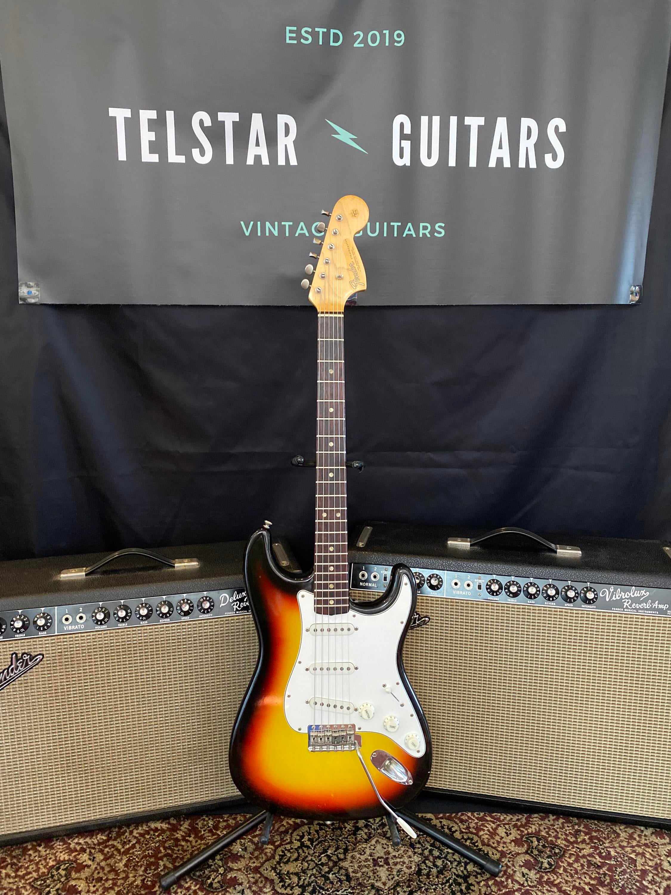 1966 Fender Stratocaster – Excellent Condition w/rosewood fretboard. This is a Fender/CBS era Strat, but it plays and sounds much like a Pre-CBS Stratocaster. It holds up to the early 1960's Strats we have. Body and finish look great, with very little wear.