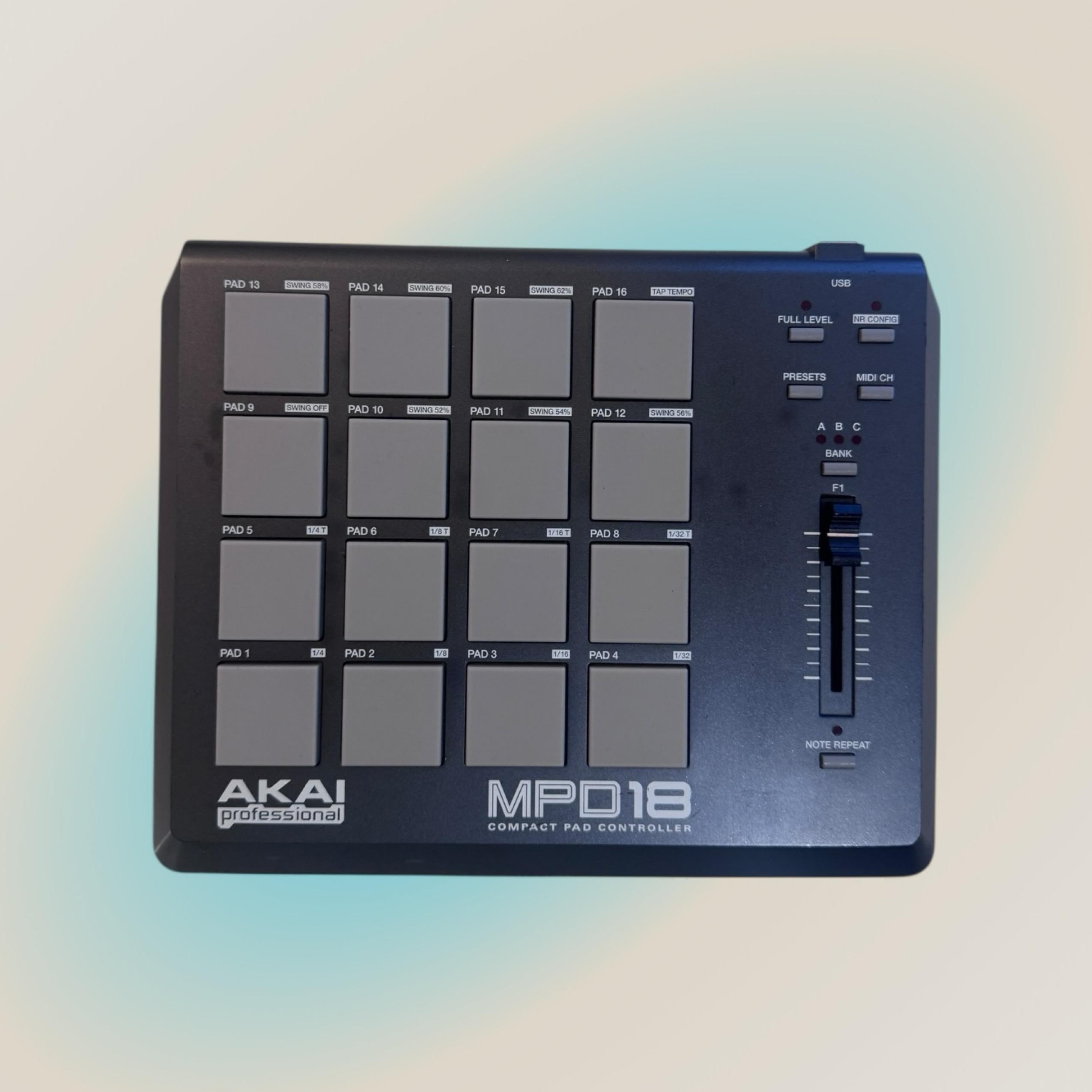 The MPD18 is the easiest way to add genuine MPC pads to your setup. This MIDI-over-USB pad controller for DJs, programmers, producers, and other musicians is built around the pads and controls from Akai Professional's industry-standard MPC series. The MPD18 is an expressive and intuitive instrument for the studio and stage. The MPD18 is built around the pads of the industry-standard MPC and contains some of the same technology that gives tracks made with the MPC an unmistakably human feel. The MPD18 is an expressive and intuitive controller for the studio and stage, and its compact footprint is easy to fit into any setup. When combined with virtually any MIDI software, the MPD18 delivers everything needed to create tracks that feel great.