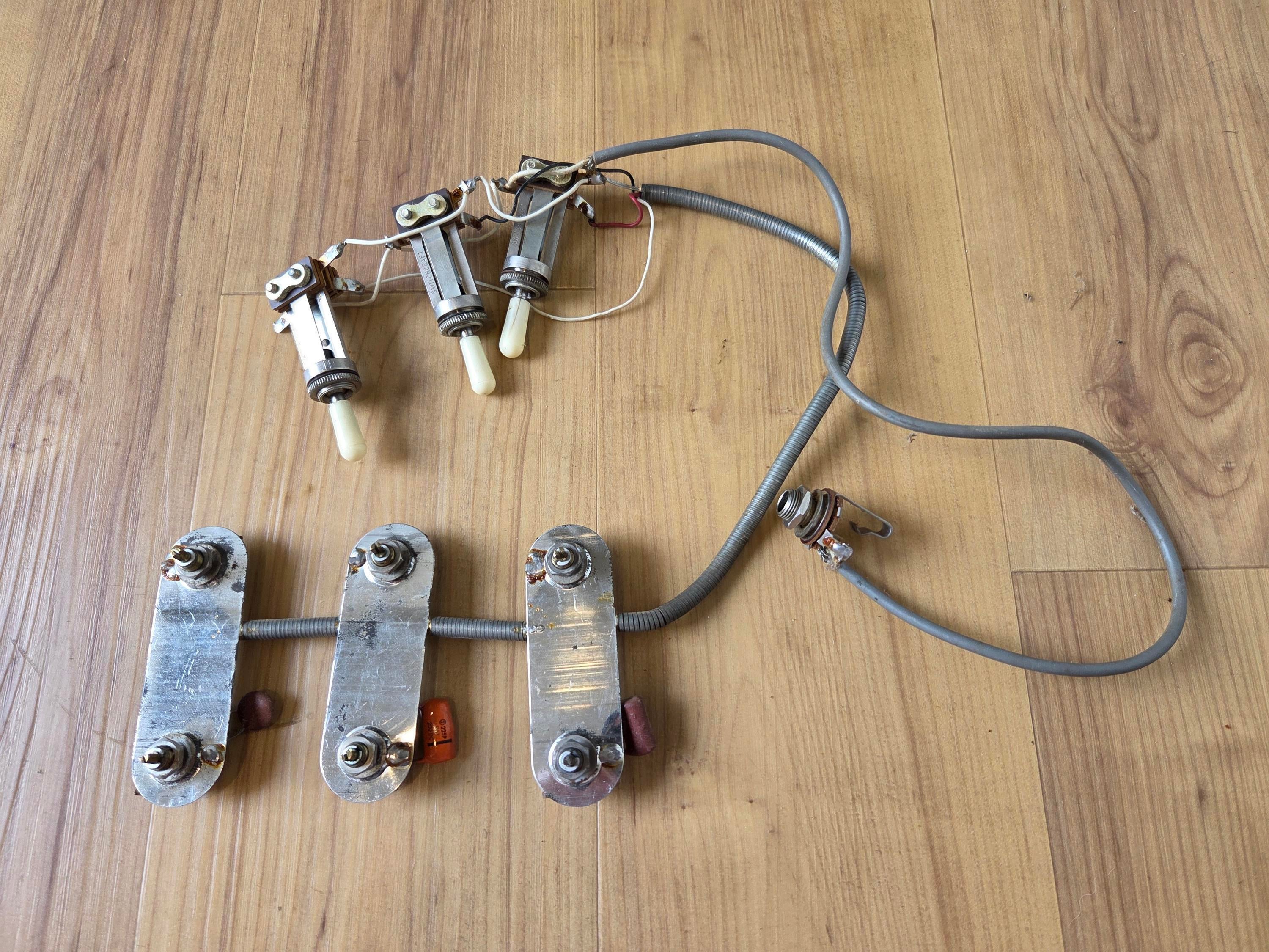 Up for sale is this vintage 1960's Harmony H-75/Silvertone 1454 wiring harness. This original harness was tested before it was pulled and everything functions as it should. The original CTS mini pots are included (1376537) along with the Switchcraft two-position switches, the jack, and the caps. All of the washers and nuts are included as well. Overall, the perfect piece to drop straight into your vintage restoration.