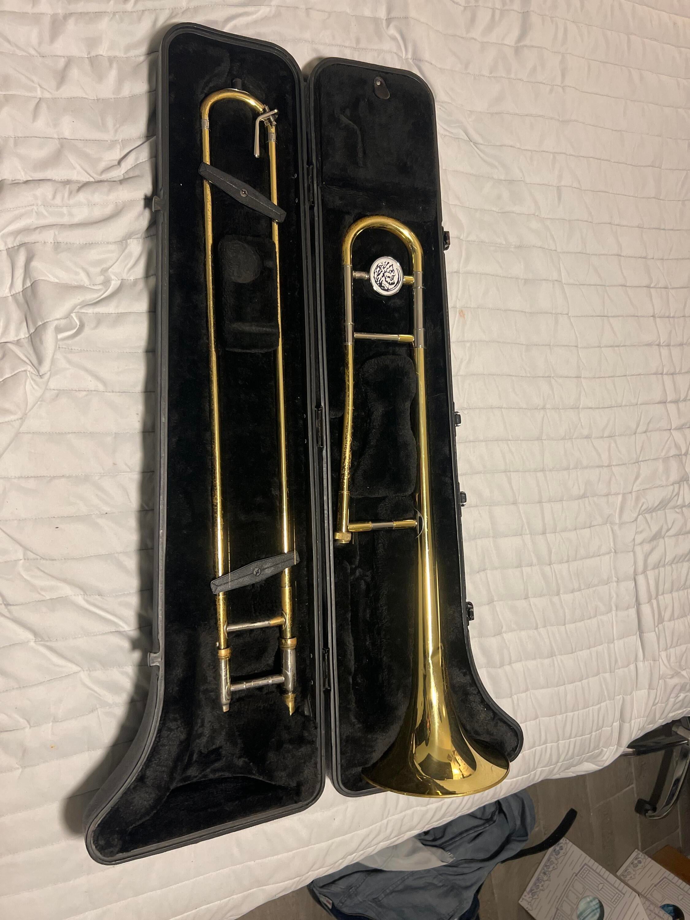 It’s completely working, all slides work, comes with original mouthpiece and a Vincent Bach 5G, contains a coupke of dents and scratches which are purely cosmetic, everything else is in working order, I’m selling because I switched my main instrument to euphonium and besides this is a beginner trombone horn, good for a beginning middle player or for rough use in marching band.