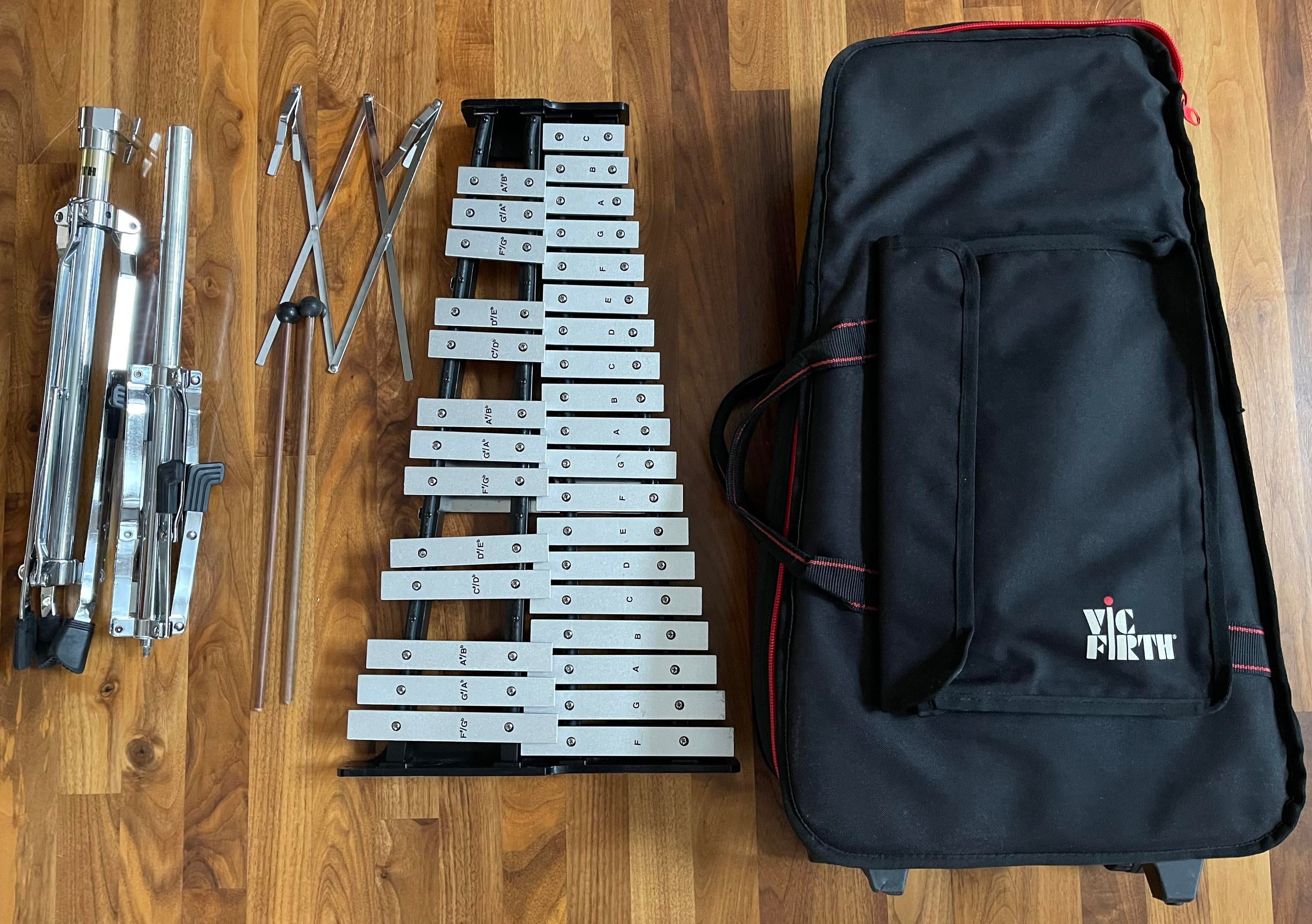 Kit includes the metal key bell instrument, mallets, metal stand that attaches to the bell instrument, sheet music holder and soft bag carry case with wheels and telescoping handle.