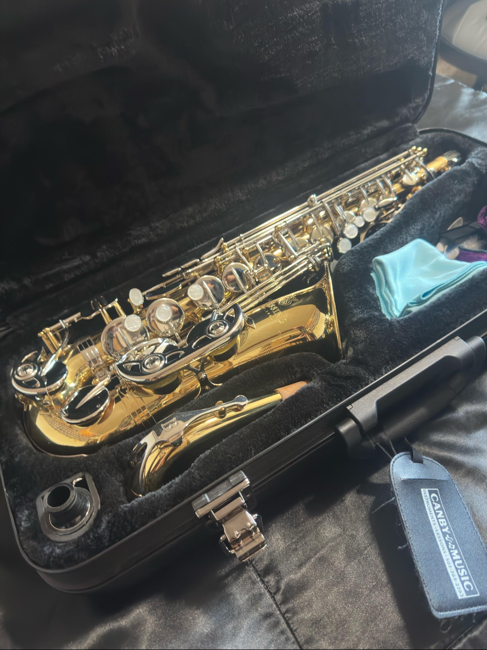 Upgrade your band game with this like-new alto saxophone (BAS-1287)! I’ve only used it for band, and it’s been super well cared for—the sax itself is in mint condition.