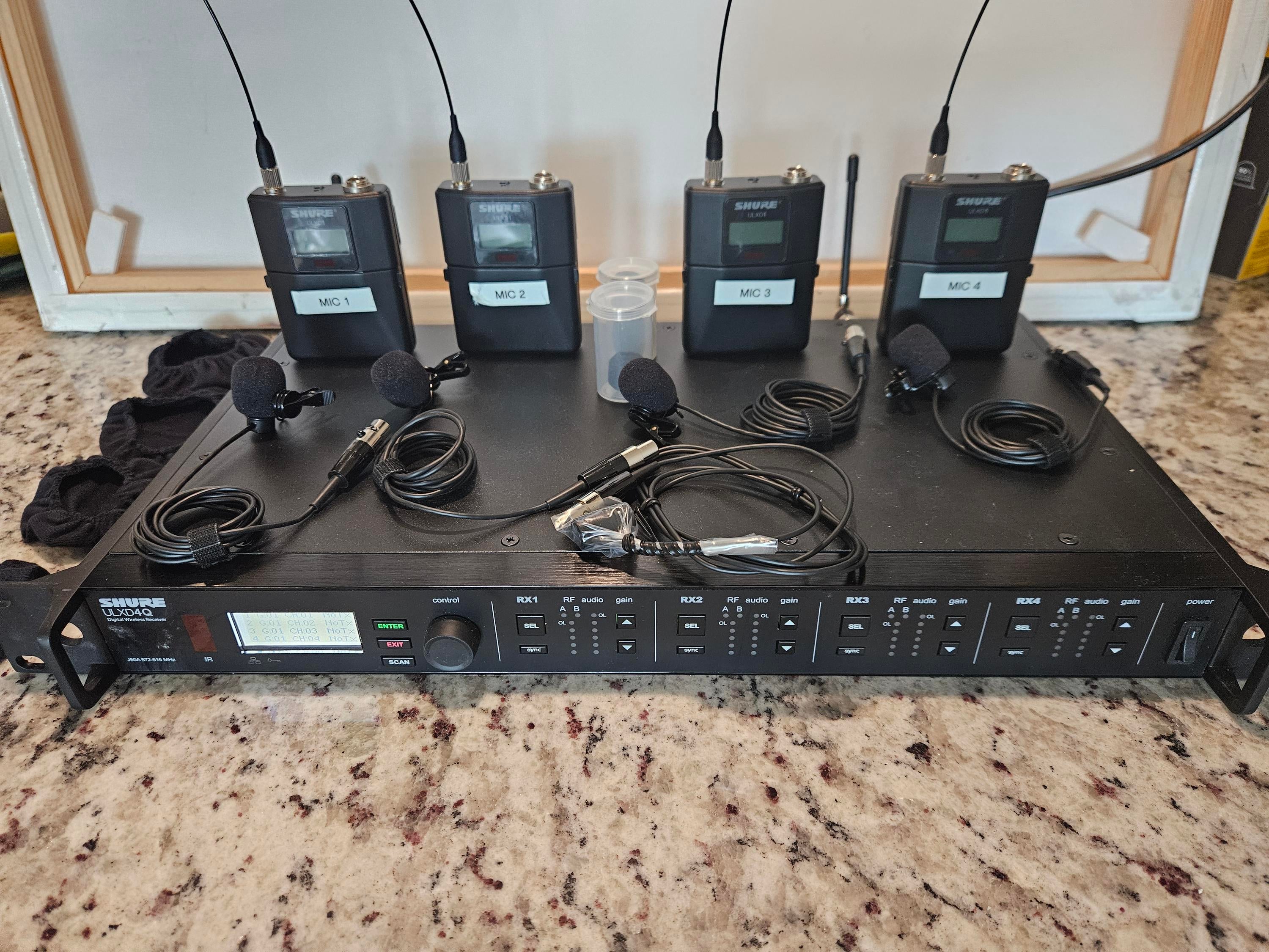 A complete Shure ULXD4Q quad channel digital wireless system in perfect working condition. This is the J50A band (572–616 MHz), which is fully legal and usable in the United States.