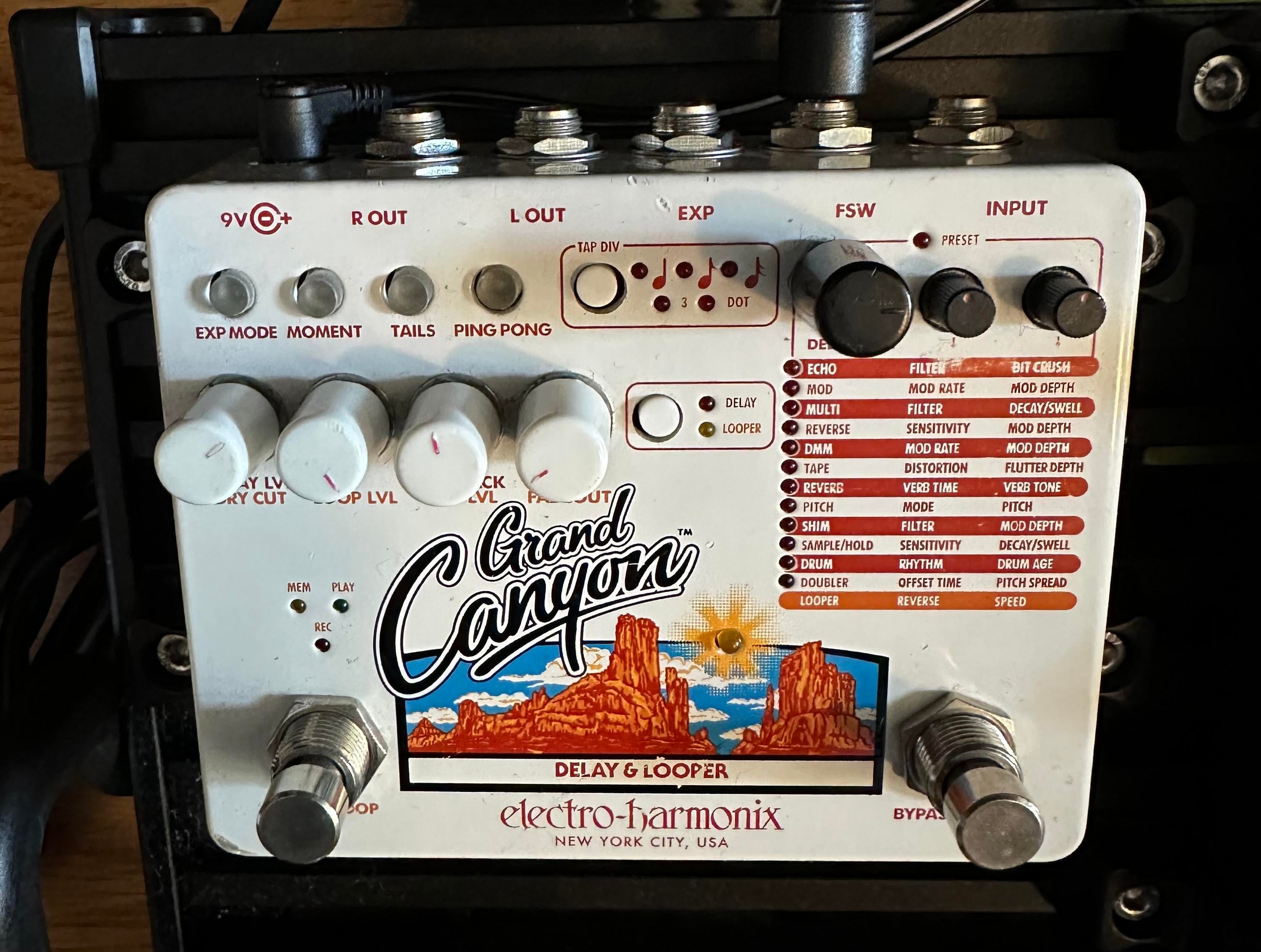 With 12 effects types plus a full-featured looper section, the Electro-Harmonix Grand Canyon Delay & Looper pedal is one of the most comprehensive and creative delay pedals you could put on your pedalboard. Effects range from vibrant delays and echos to animated pitch effects, reverbs, sample/hold, and more. The looper provides up to 16 minutes of recording, and your looped audio remains until you clear it — even after you turn the Grand Canyon off. For more delay effects and looping capabilities than you could ever ask for, check out the Electro-Harmonix Grand Canyon Delay & Looper pedal.