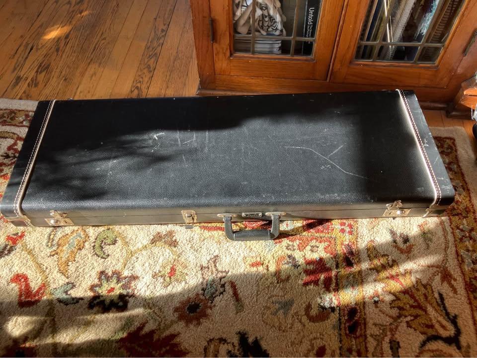 G&G-made Fender case for Strat/Tele guitars. There were subtle changes in these over the years, and this one is from the late-1980s. Red plush interior. All exterior latches functional. Plywood is solid. Expected cosmetic wear. No funky smells whatsoever - a rarity for an old case.