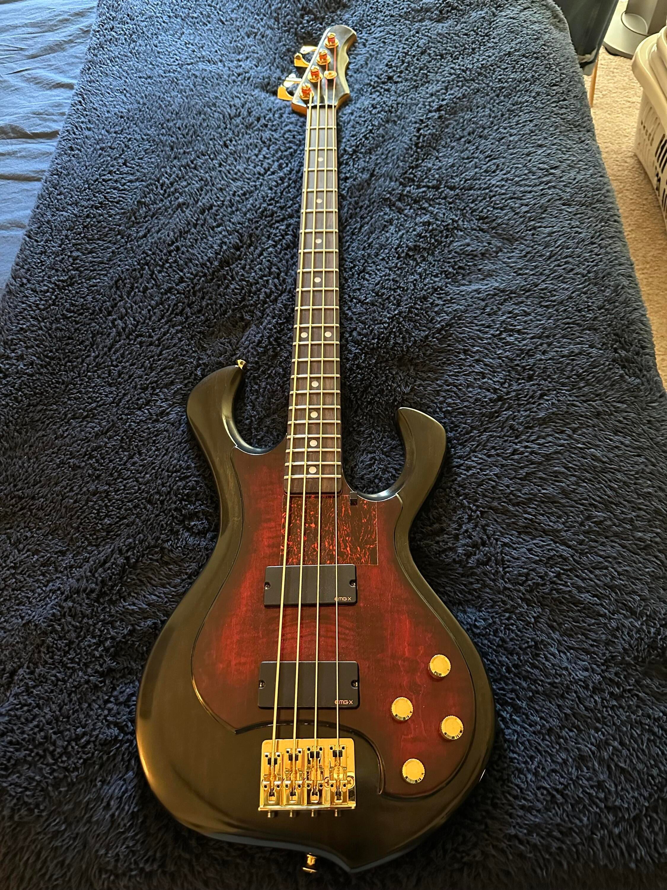 This one features a chambered beech body with a flamed maple "cap." It's a super-curvy instrument with all sorts of contouring and it feels really cozy in the lap. I think it has a bit of a Mosrite feel to its body, in a way, even though it's a thoroughly-modern instrument. It has a Fender-style bolt-on neck, balances well in the lap and on a strap, and definitely has its own distinct presence. The two active EMG 35 TWX pickups are coil-split-enabled via a push/pull pot so you can get "meaty" rich sounds as well as some vintage-like, J-Bass sounds right in the same rig. So overall a fast-playing, comfy, stand-out, eye-catching instrument with solid features and an interesting selection of woods and hardware.