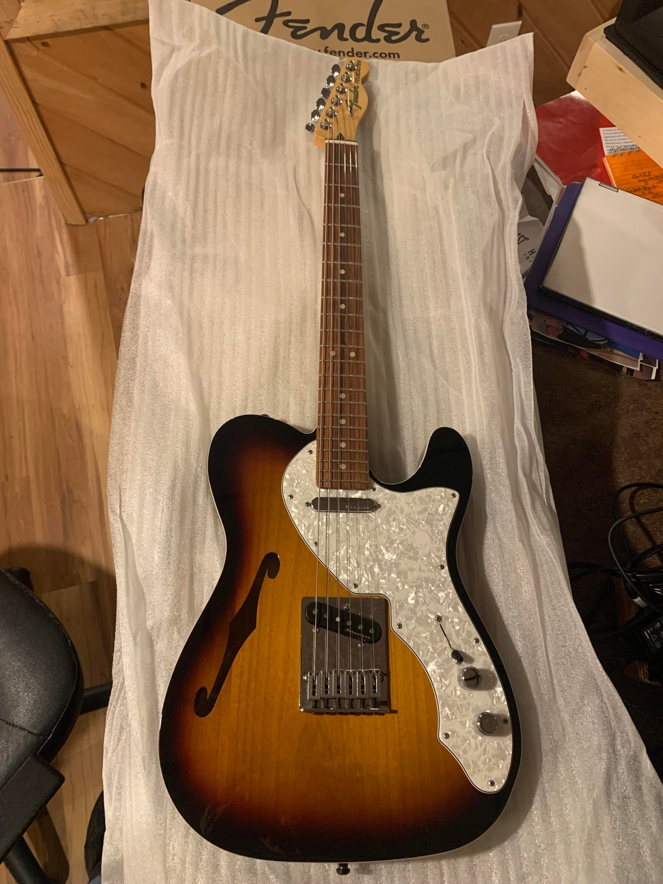 Selling a Fender Deluxe Telecaster Thinline Pau Ferro Fingerboard electric guitar 3 color Sunburst Bought it brand new from music store in 2021 also when bought new at it set up at additional cost and had the set up tech install the quick release strap holder and also bought the quick release strap at additional cost. The guitar never needed it since new and has been sitting ever since it was bought. It was hanging on guitar hook in home as a show piece but put it back in the box ready to go. It has less playing time than a new guitar on a rack in music store. Sll the pictures were just taken in April 2026. . All the specs are below