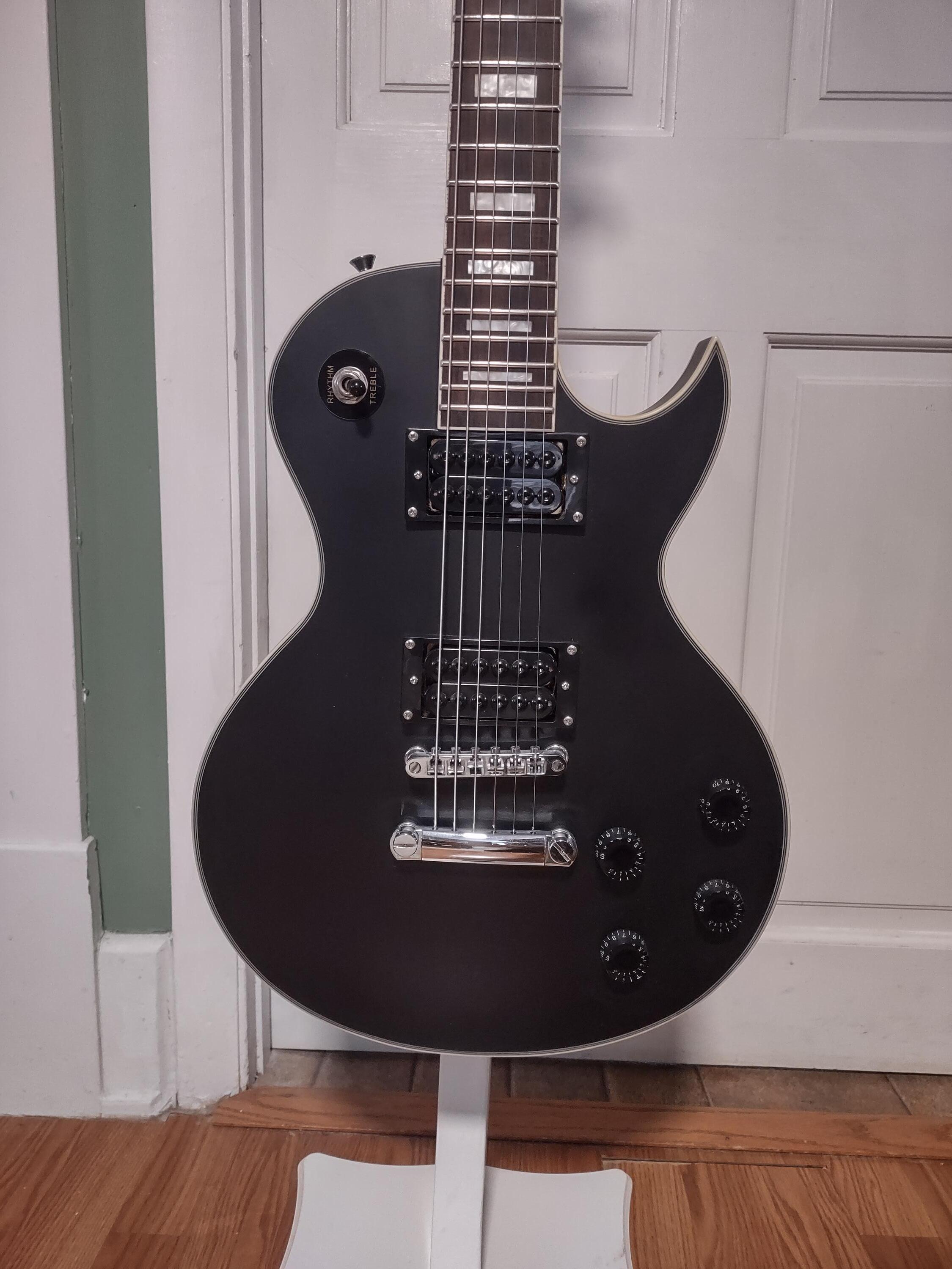 Awesome Leo Jaymz Double Cut Deluxe in Satin Black with upgraded Grover tuners and Invader style Pick-ups. Absolutely great shape. Plays and sounds amazing. Anyone looking for en ESP Les Paul style guitar would be happy with this. Don't miss out.