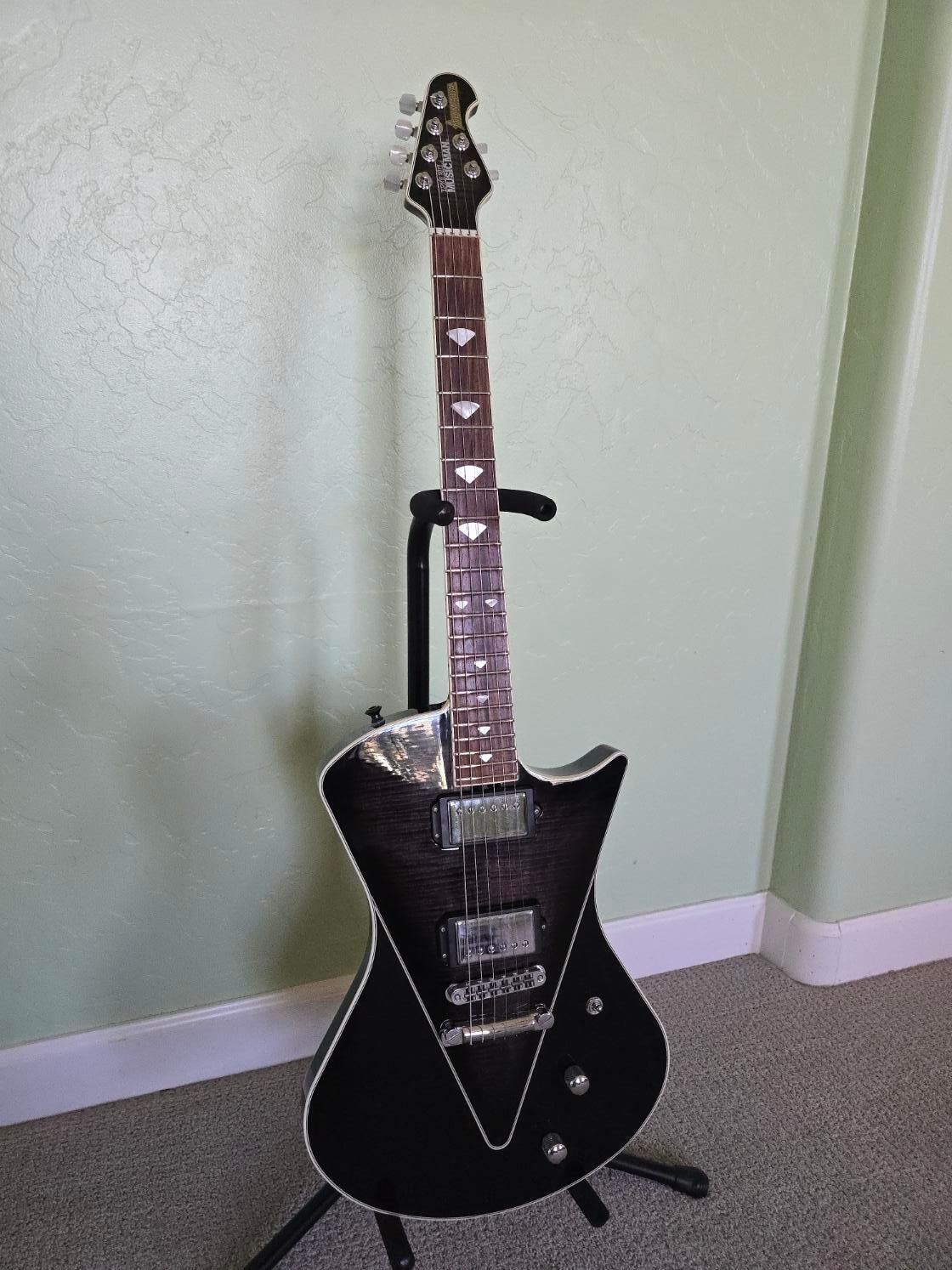 Highlights are Mahogany neck-thru, Flamed Maple Cap, Gibson scale, Tuneomatic bridge, angled headstock, Schaller locking tuners, Rosewood Fingerboard, with custom Music Man pickups. Look on the Music-Man website for more videos and specs.