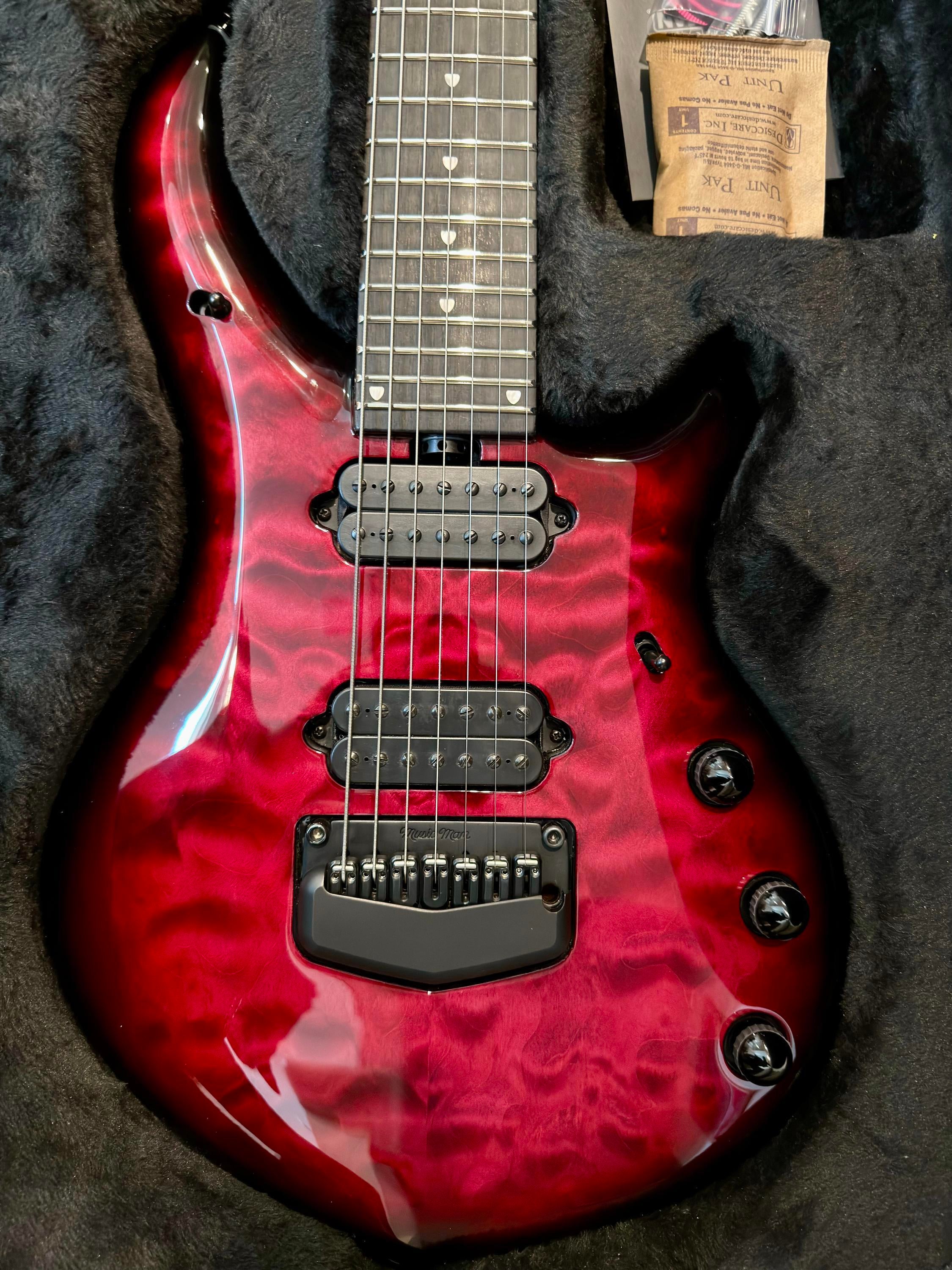 am letting go of my Red Nebula Ernie Ball Music Man BFR John Petrucci Majesty 7. This was a run of only 50 made. It has been played in my home studio in a smoke free home, but is in excellent condition. No chips, dings, gouges, scrapes....just some light surface scratches where my had was while playing (I tried to show these in the pictures). I installed some noiseless springs and a Tremol-No system, but I kept the original hardware if you wish to put it back to stock. I never used it with the signed backplate, and always kept it in the case so that the signature did not get damaged or fade. It comes with its case and all case candy including the certificate (all pictured). This is the guitar you will recieve, so look over the pictures and feel free to ask me any questions...