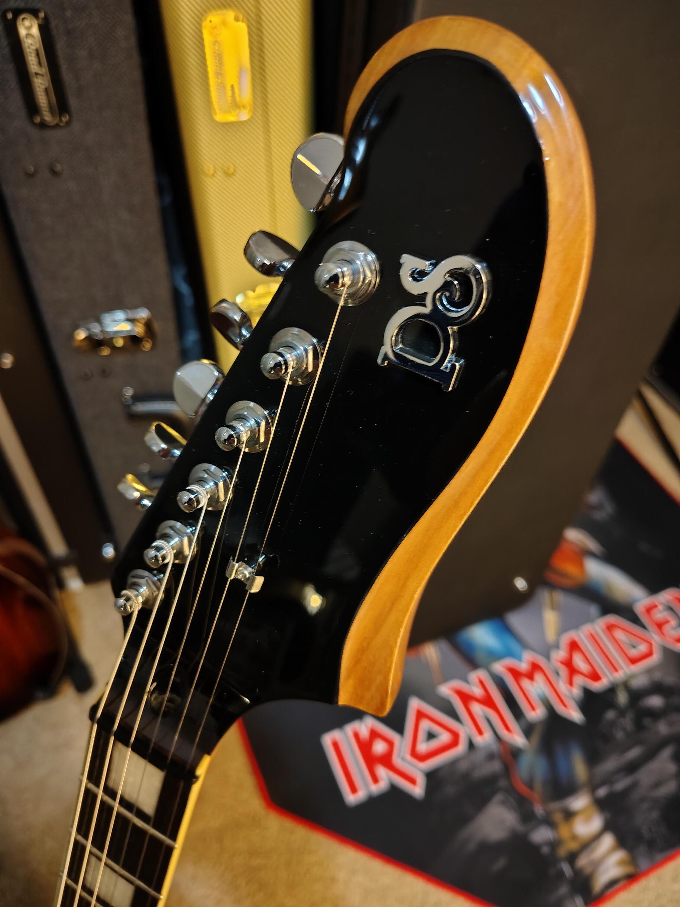 Excellent condition solid mahogany body with high gloss black finish mahogany satin neck with rosewood fret board med jumbo frets 24.75 scale length 12" radius two volume two tone knobs 3-way switch locking tuners comes with gigbag
