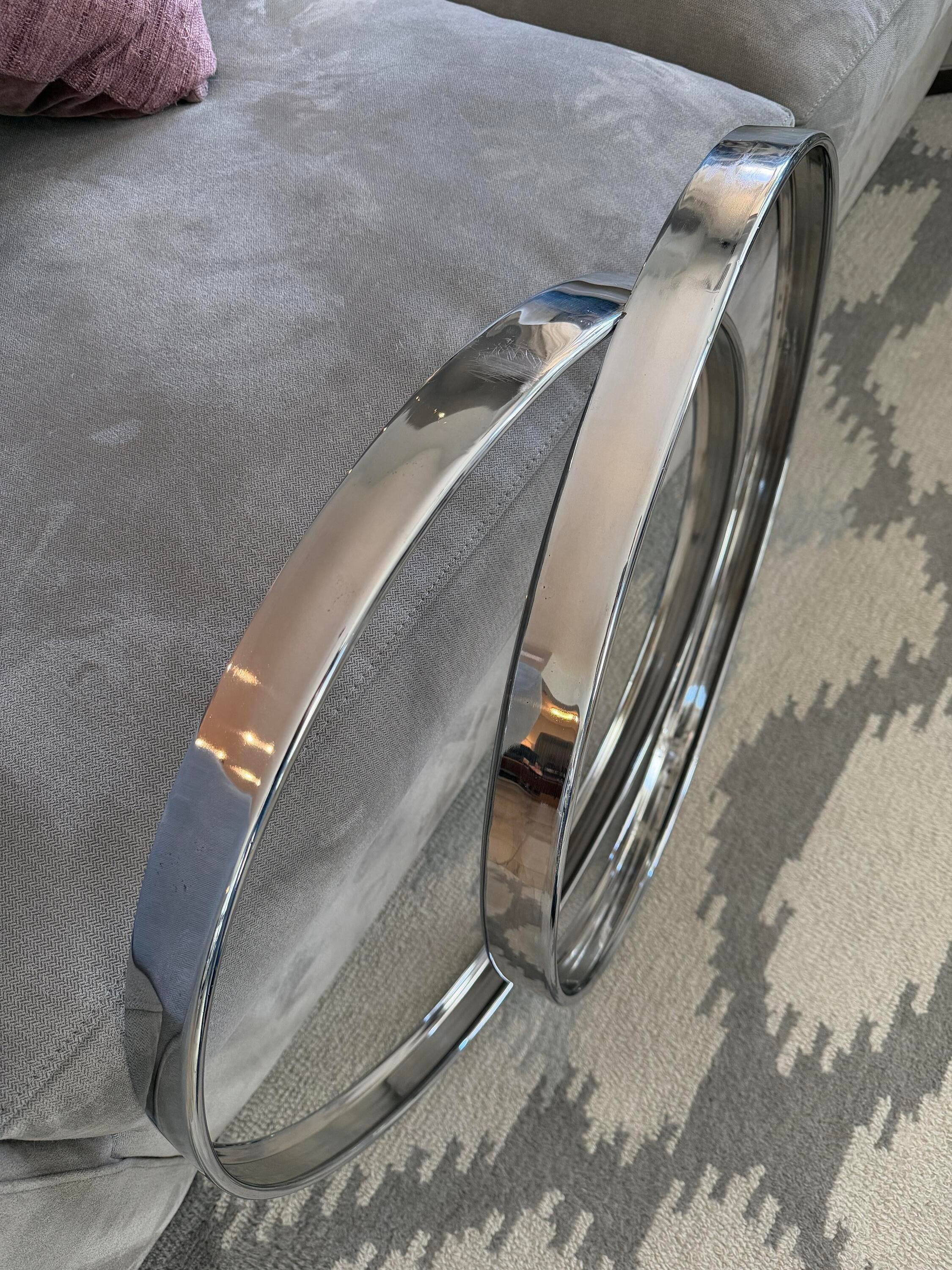 I have a pair of awesome vintage Sonor ferromanganese bass drum hoops in a chrome finish. These are 22" in size. They have a flat edge (drum head side) and a rounded edge (claw side)