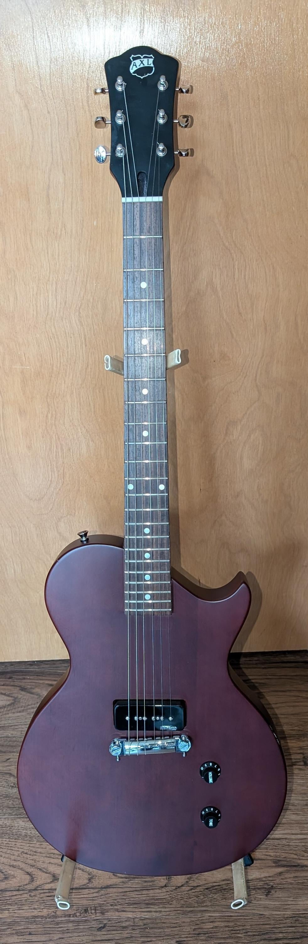 This came to me as a finished blank from the factory. I installed the following brand new parts: Guyker Pro locking tuners, bone nut, nickel silver medium jumbo frets, Wilkinson M series P-90 (9.14 ohm), Allparts jack, CTS 250K US pots, La Bella strings. Result is a 7.2lb. mahogany guitar that plays and sounds great.