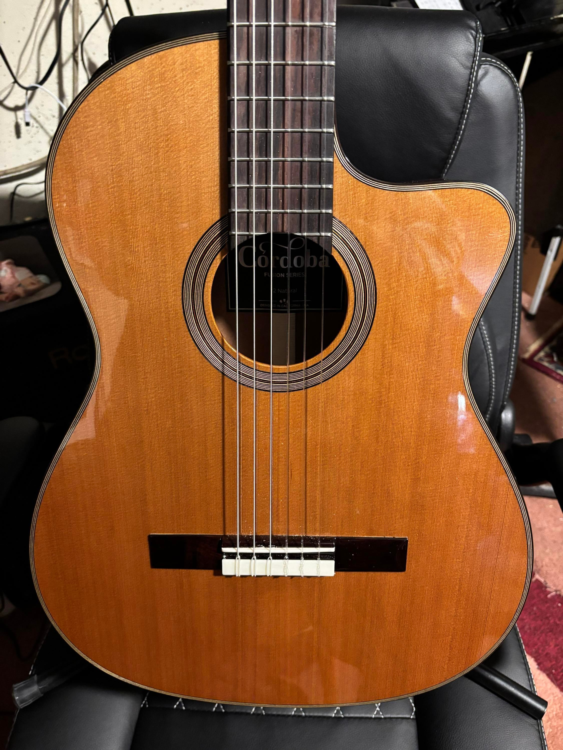 Cordoba Fusion 12. Just purchased (Nov.2025). Customized "low action" Bridge/Saddle. Electrics in perfect "like new" condition. This is a great deal for someone considering a Cordoba Fusion. Brand New D'Addario Extra Hard Tension-Pro Arte Strings. Reason for selling: Upgrading to more expensive model.