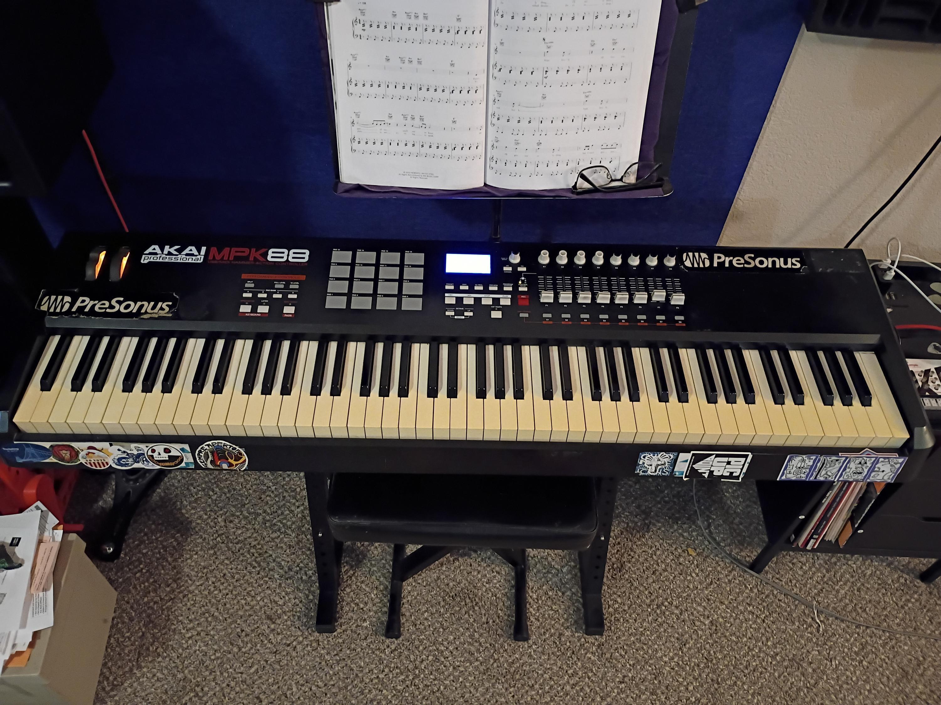 Mostly functional MIDI controller. MIDI I/O needed for this item as the USB port is non-functional. Everything else works though. Scrapes, stickers, yellowed keys, & cosmetic blemishes on this item. 88 fully weighted keys make this a great practice-piece for piano players. Connects to & controls outboard & digital synths/drum machines. Power supply included. Pick up only.