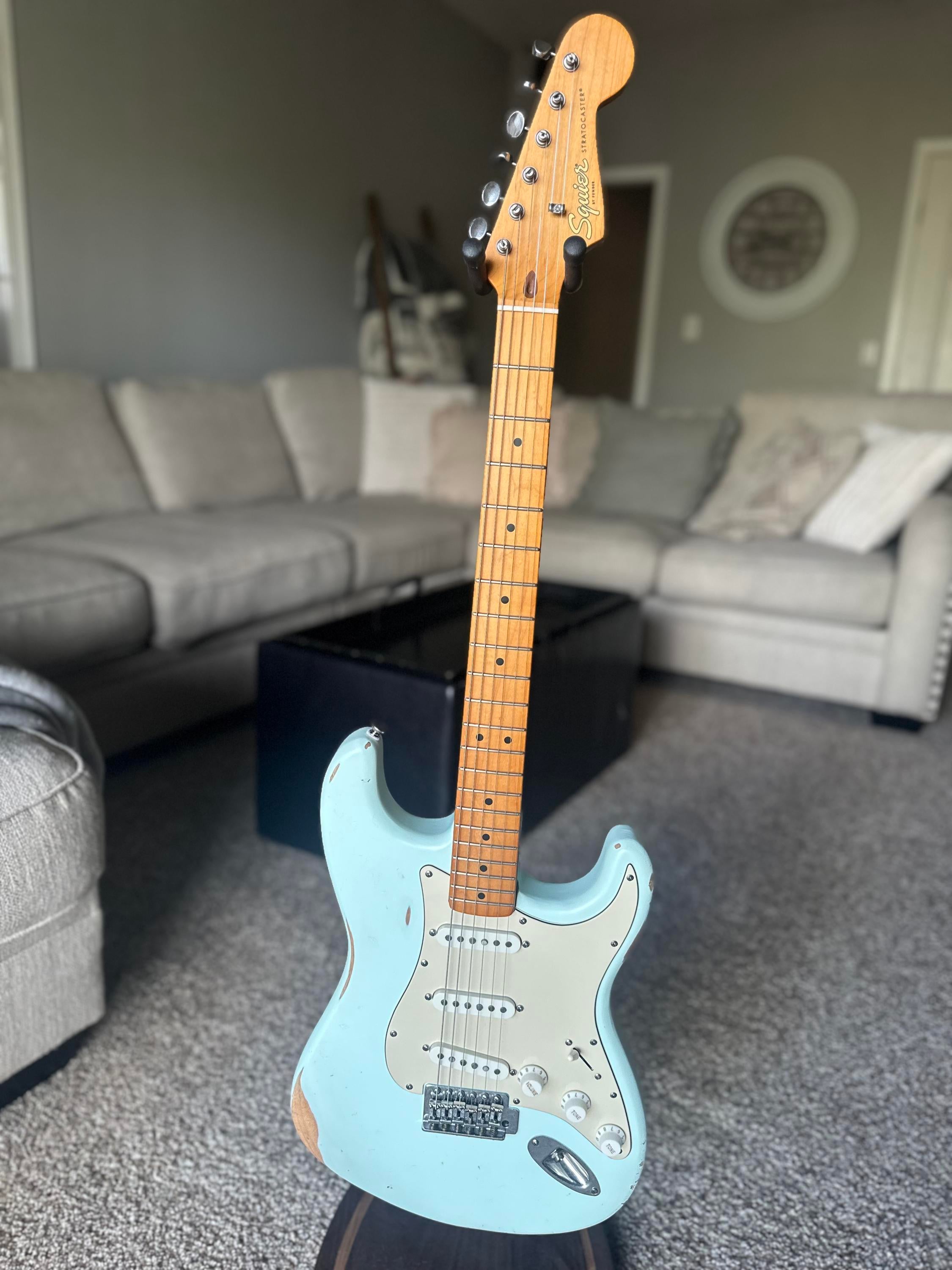 This Squier Strat has been a fun project for me as I did the relic to match the look of a relic custom Fender strat. Sonic Blue with upgrades including an upgraded fender string block, a pure tone input jack and vintage white pick guard. (I am including the original one with the sale)